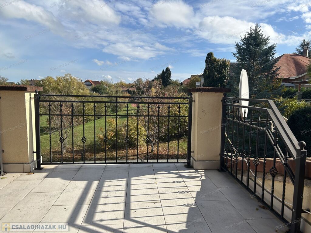 A kertben egy 10 méter hosszú, 3,6 méter széles kültéri medence kínál felfrissülést az egész családnak, a gyepszőnyeggel borított, mesés kert gondozását pedig egy automata öntözőrendszer teszi gondtalanná.