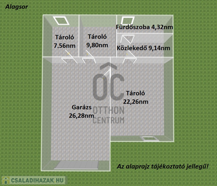 Az alagsorban található egy 26nm-es garázs, egy fatároló, ahol helyet kaptak a kazánok is, 2 külön tároló és egy fürdőszoba, innen is feljuthatunk a földszintre. A földszinten egy előszobába érkezünk,ahonnan egy mosdó nyílik, 2 szoba, 1 étkező és 1konyha is helyet kapott. Az emeleten további 3szoba és 1 fürdoszba(zuhanyzóval, káddal egyaránt ellátott) található.