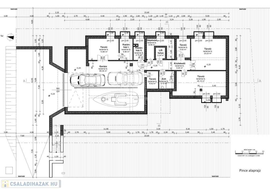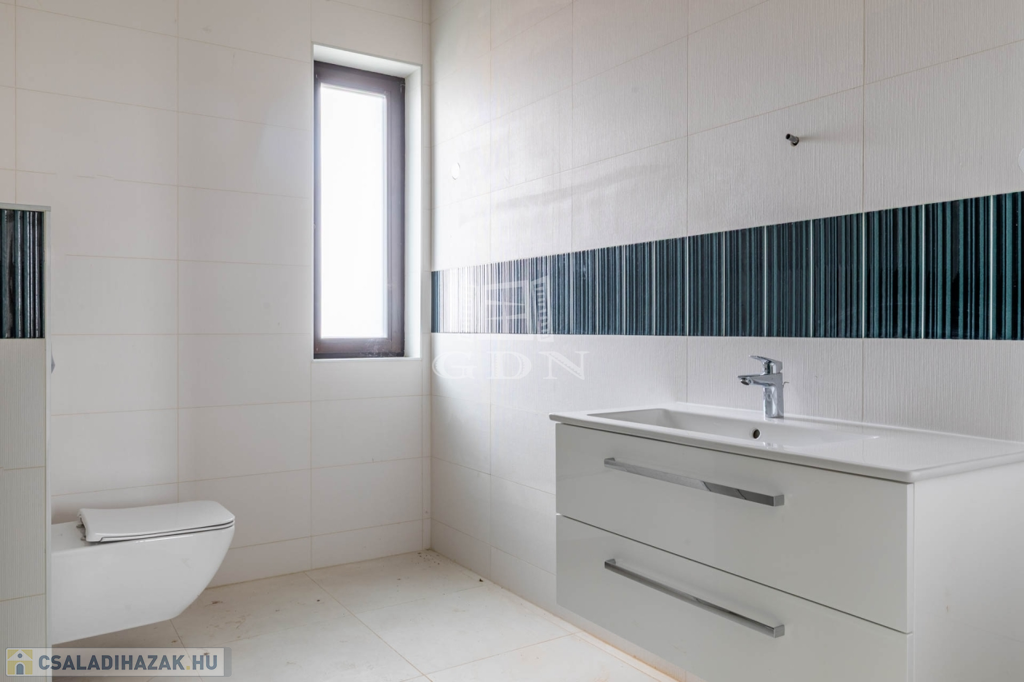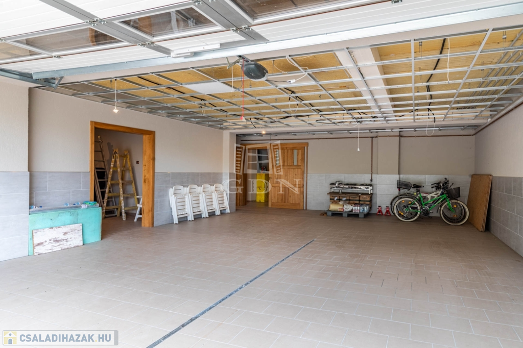 A 195 nm-es nettó alapterületű fűtött alagsorban található egy 85 nm-es egylégterű garázs, melyben 4 autó vagy akár 2 autó és 1 kisebb méretű hajó is kényelmesen elfér, valamint több tároló, vizes blokk, gépészeti és háztartási helység, továbbá egyéni igények szerint kialakítható kondi terem, mozi szoba, borterem. Fűtése korszerű gázkazán, padlófűtéses hőleadással, valamint másodlagos fűtésként vegyes tüzelésű kazán is kialakításra került, a ház minden szinten klíma kiállással rendelkezik, kiépített riasztórendszerrel ellátott. Az épület a lépcsőház mellett lift előkészítéssel (liftaknával) kiépített, mely mind a három szintet összeköti.