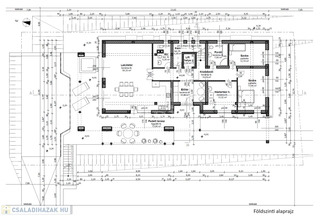 A 150 nm-es nettó alapterületű földszinten nagyméretű előszoba, 1 amerikai konyhás nappali, 2 hálószoba, 2 fürdőszoba, háztartási helység, kamra található. Körbe fedett 73 nm-es terasszal rendelkezik.