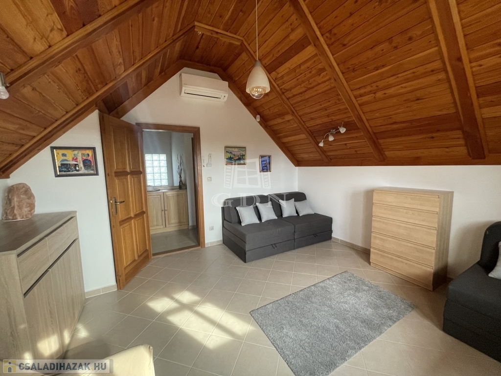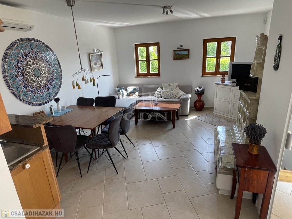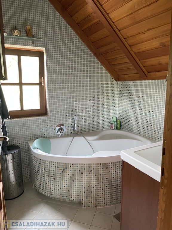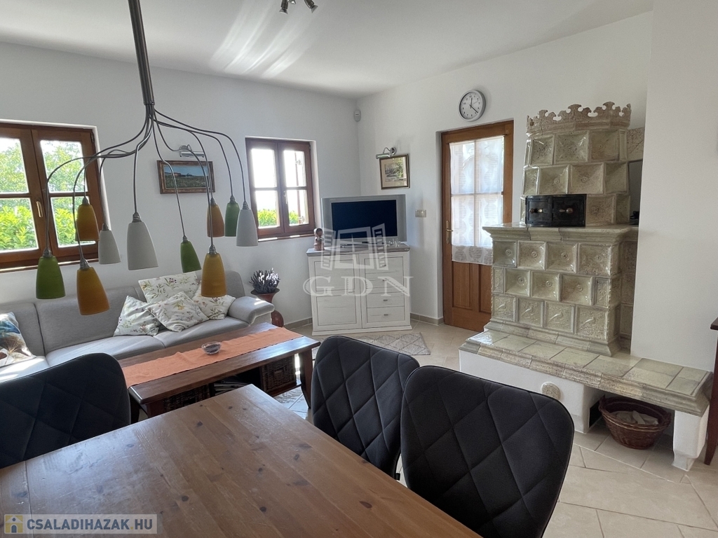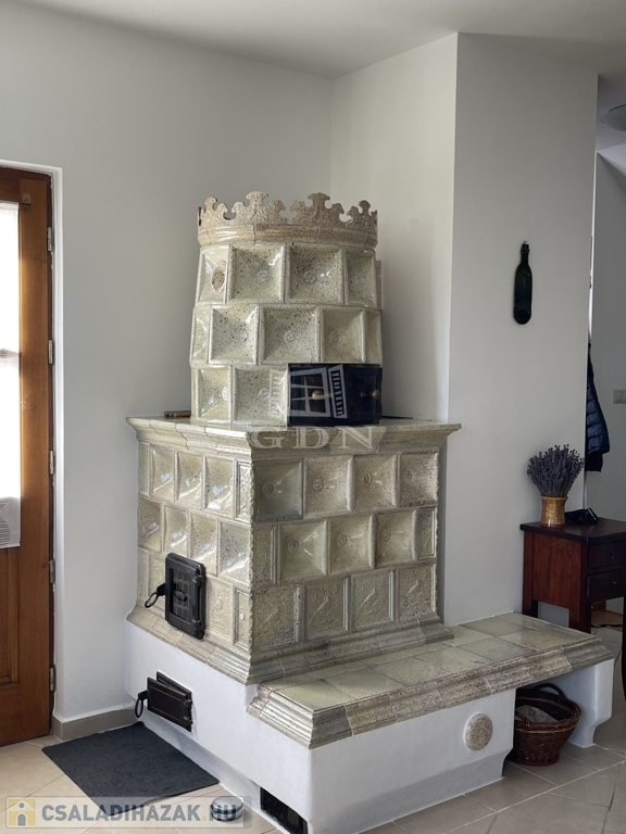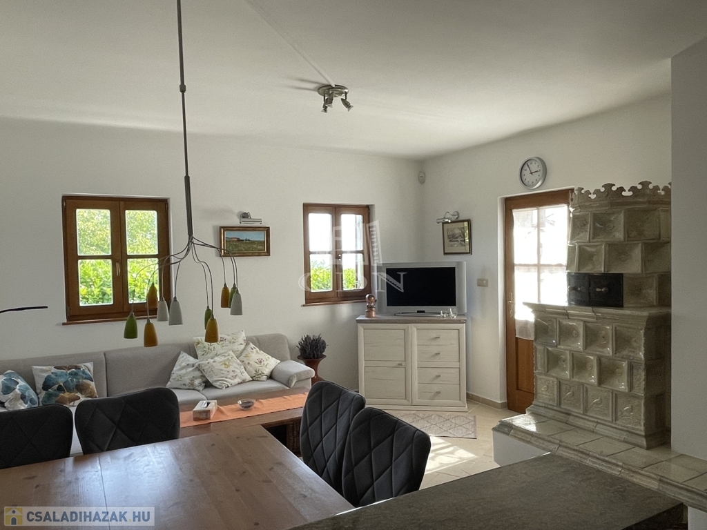 Kiegészítők: sütőfunkciós cserépkályha, infraszauna, félköríves terasz (25 m²), melynek burkolata felújításra szorul, így lehetőséget biztosítva a további egyéni igények kialakítására.