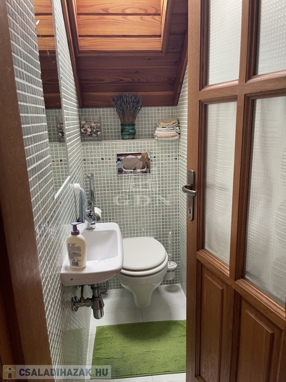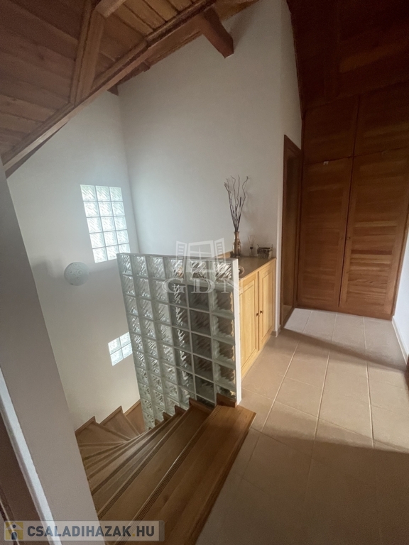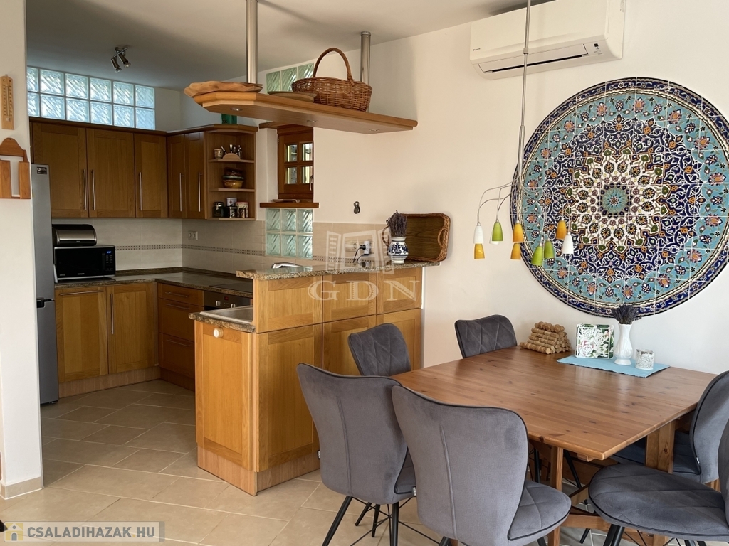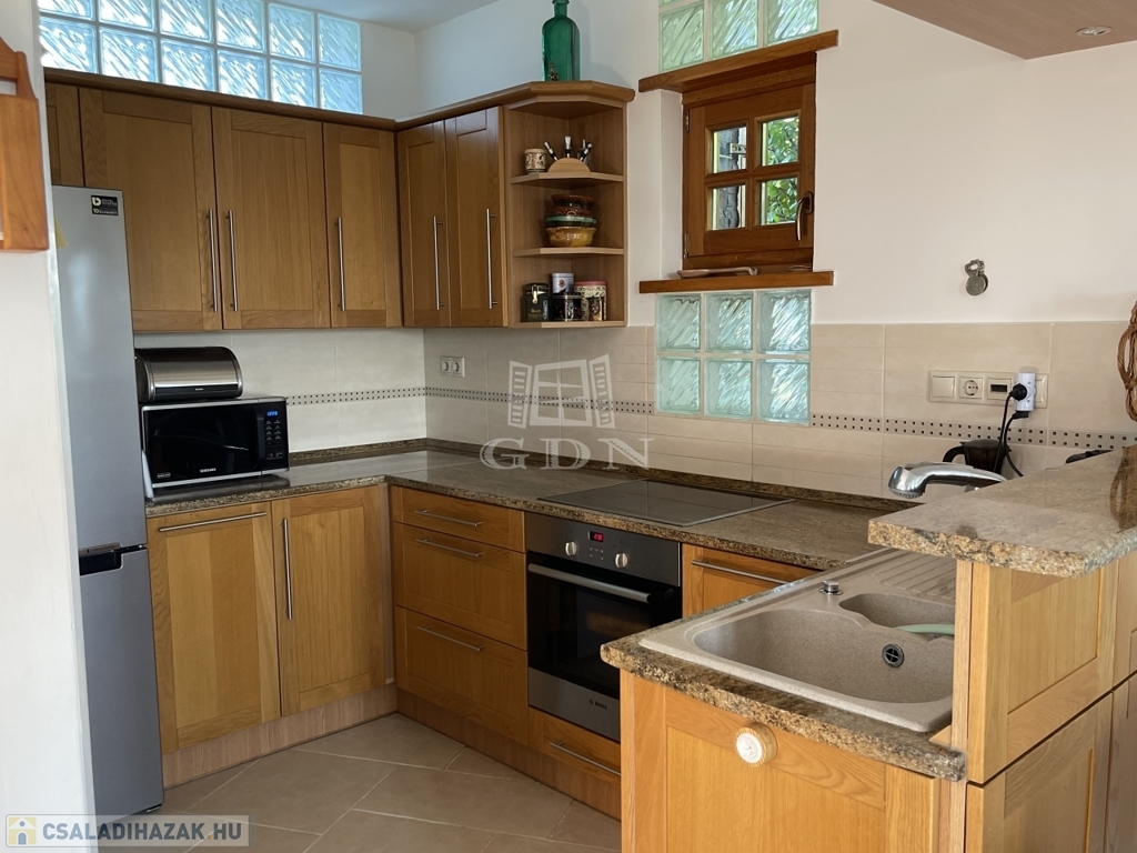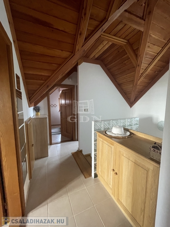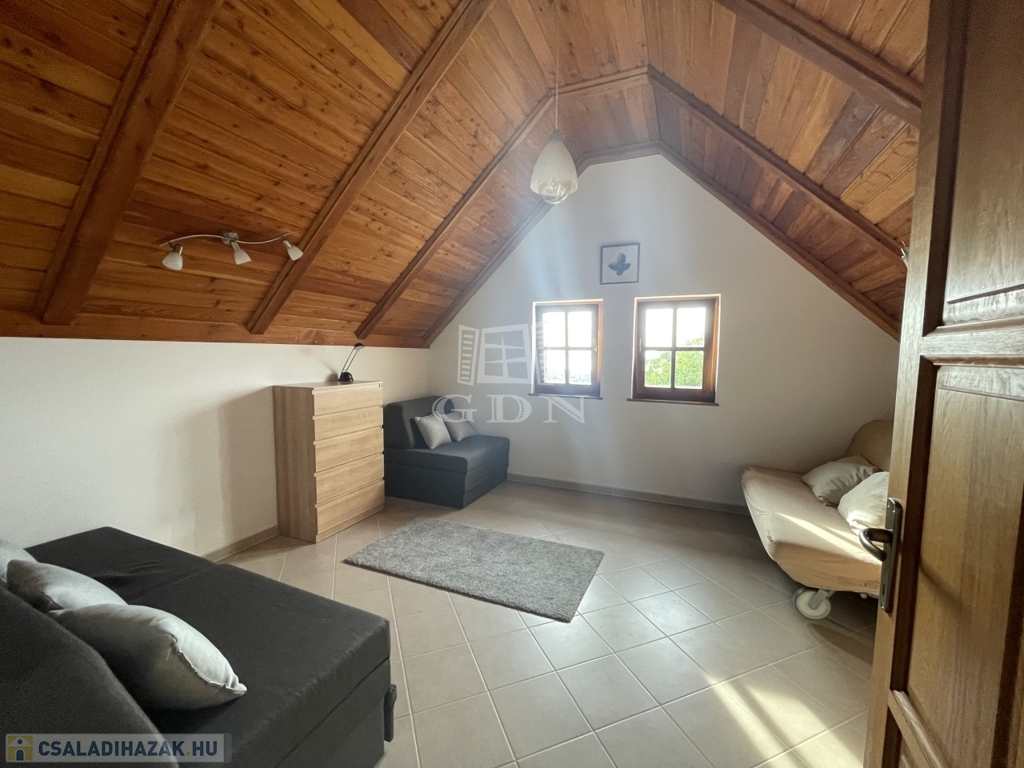 Kiegészítők: sütőfunkciós cserépkályha, infraszauna, félköríves terasz (25 m²), melynek burkolata felújításra szorul, így lehetőséget biztosítva a további egyéni igények kialakítására.