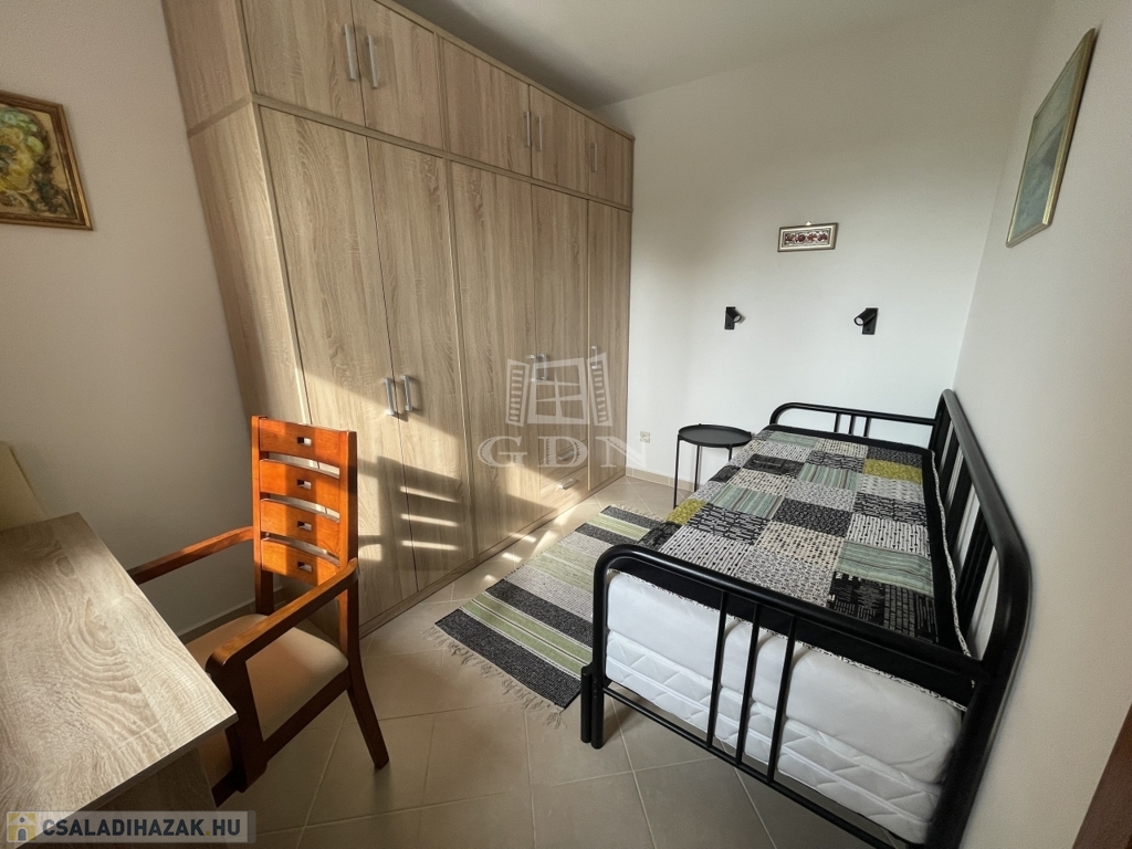 Emelet: 2 hálószoba (20 és 10,2 m²) split klímákkal, sarokkádas fürdő (4,1 m²), külön WC (1,6 m²), tároló