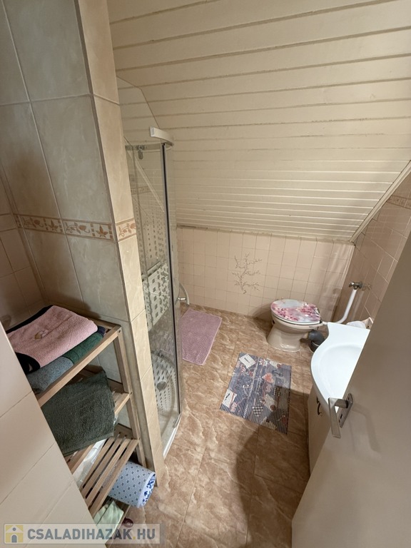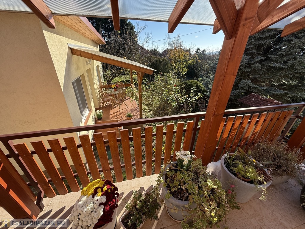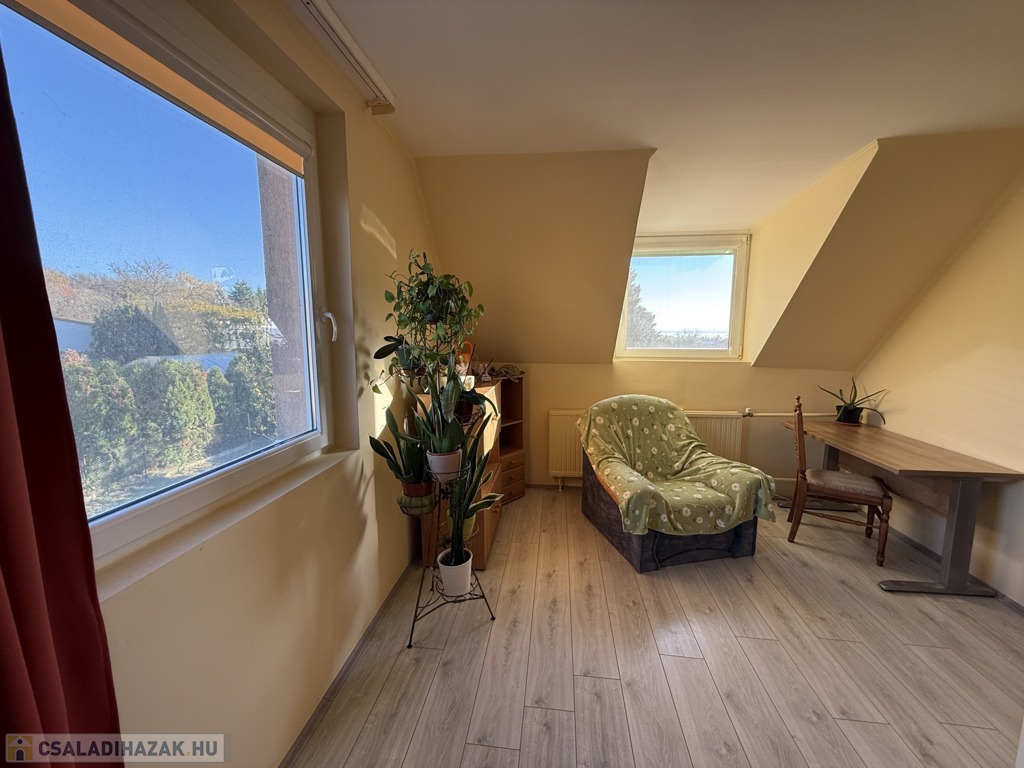 Az emeleten két hálószoba, az egyik erkélyes, mely külön kis reggeli menedék, ahol egy kávé mellett élvezhetjük a természetet, továbbá e szinten egy praktikus beépített szekrénnyel ellátott közlekedő és egy zuhanyzós fürdő kapott helyet.