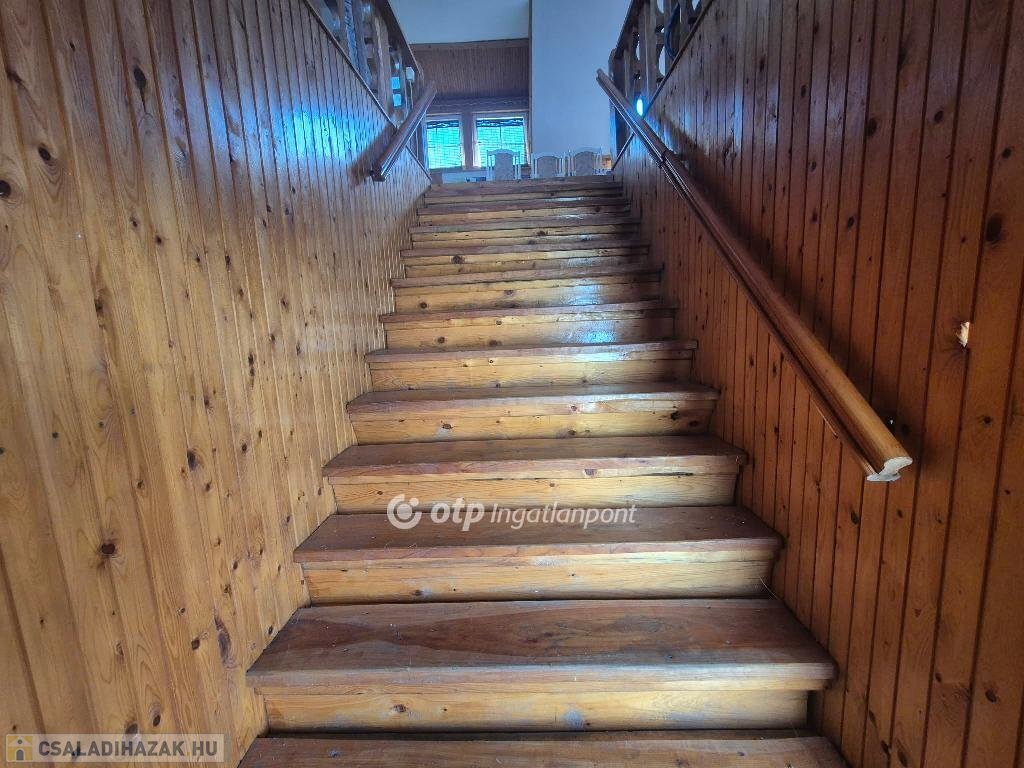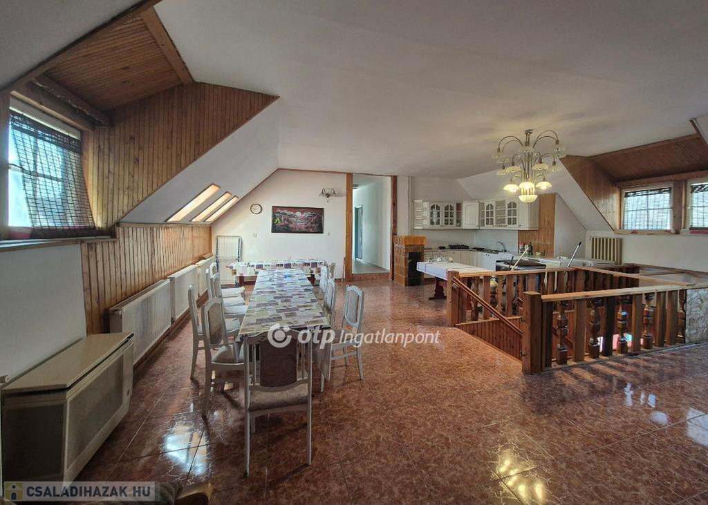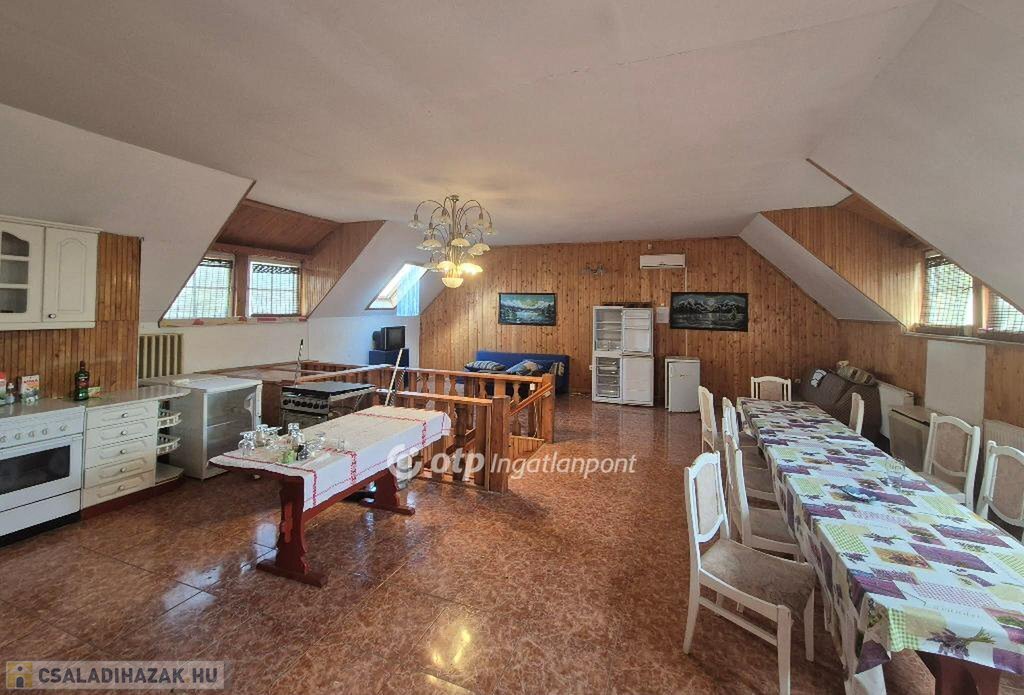 Földszintjén kiszolgáló és tároló helyiségek, egy kisebb lakás fürdővel, és 2 WC találhatók. Hozzáépítésre került még egy fedett terasz is. Tetőterében egy közös, tágas amerikaikonyhás nappaliból nyíló folyosó vezet a 6 különálló egységhez, amit hotelszobaként használtak: minden szobához tartozik egy zuhanyzó WC-vel. Tetőszerkezete ép: zsindellyel és a fedett terasz cseréppel fedett. A földszinti 2 db WC akadálymentesített.