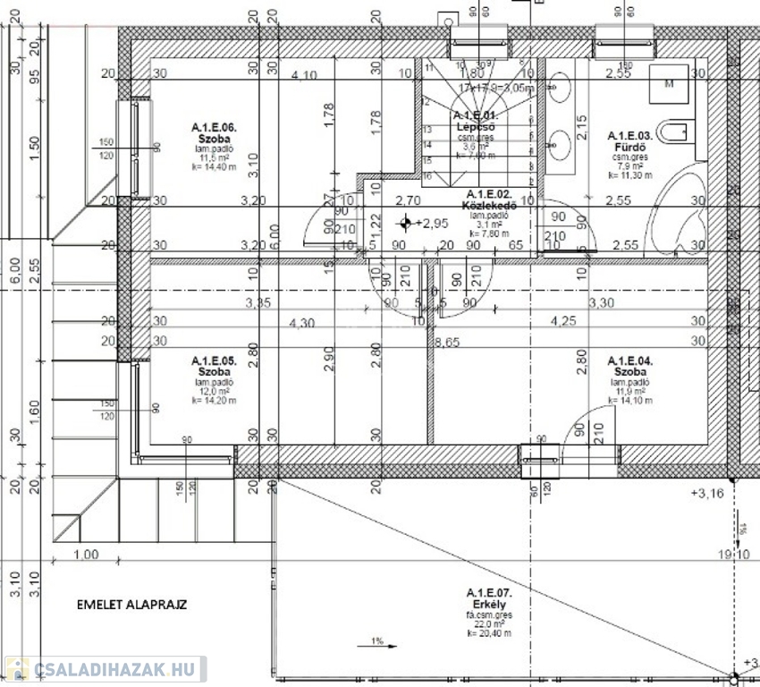 Emelet (50m2): 3 szoba, fürdő+wc, erkély (22m2)
