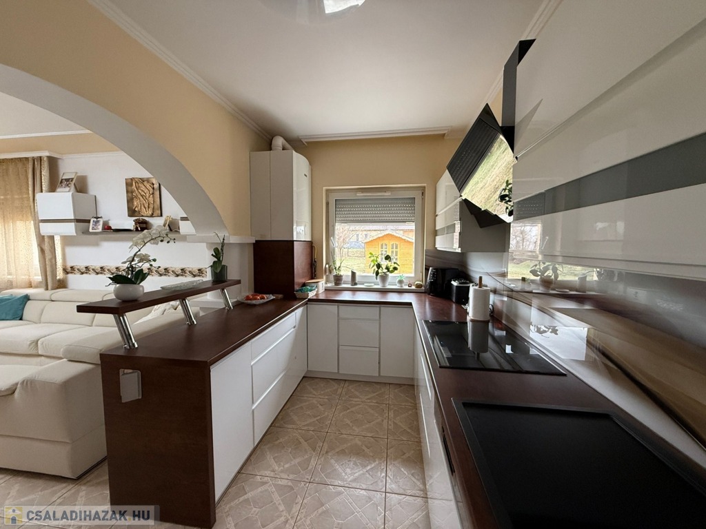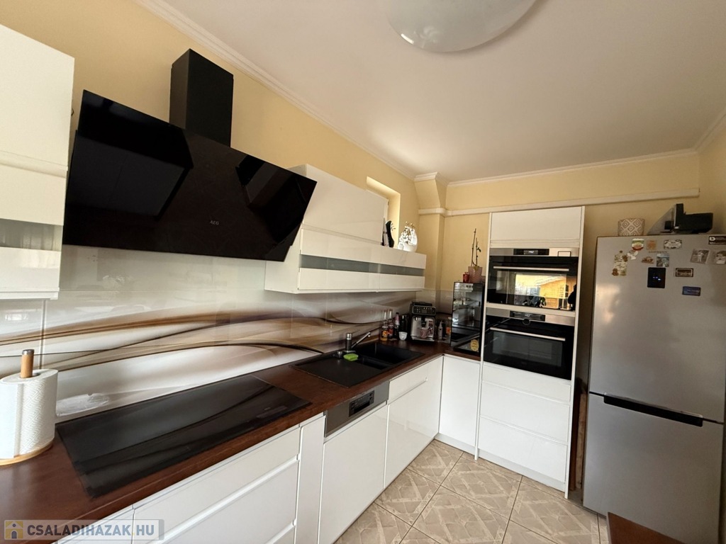 A 2021-ben készült, egyedi méretre gyártott, teljesen gépesített konyhabútor nemcsak modern, hanem praktikus is, a részleges burkolatcserék pedig friss, ápolt összképet adnak az otthonnak.