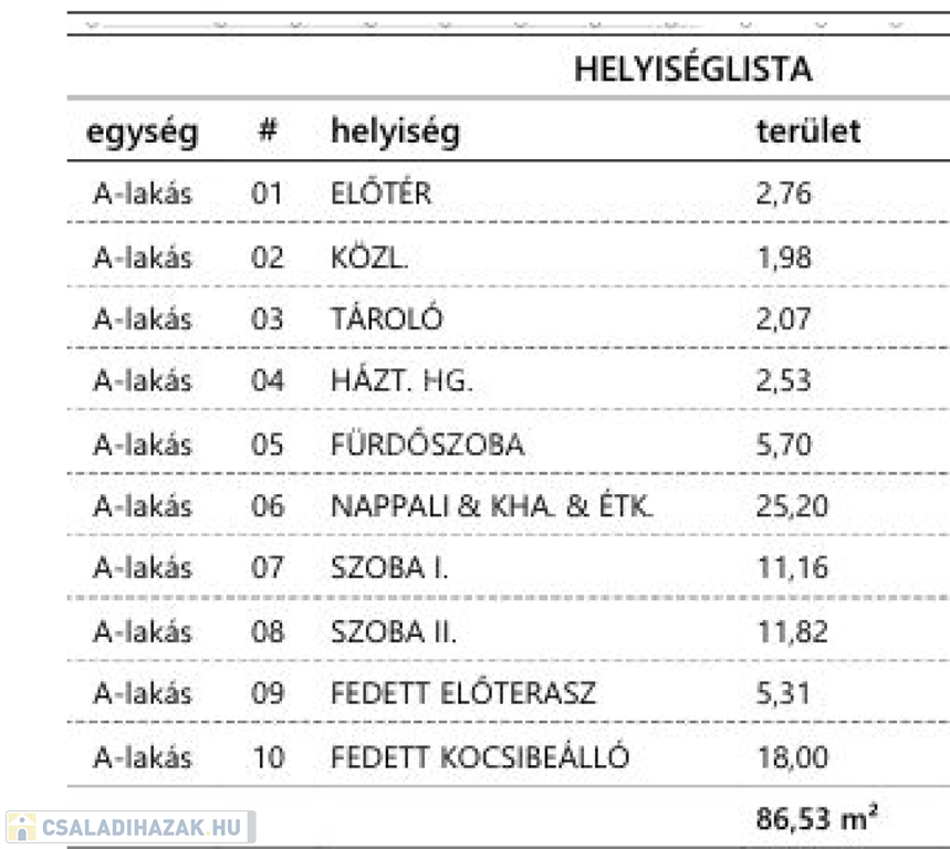 A házhoz tartozik még 5 nm terasz és 18 nm fedett gépkocsibeálló is.