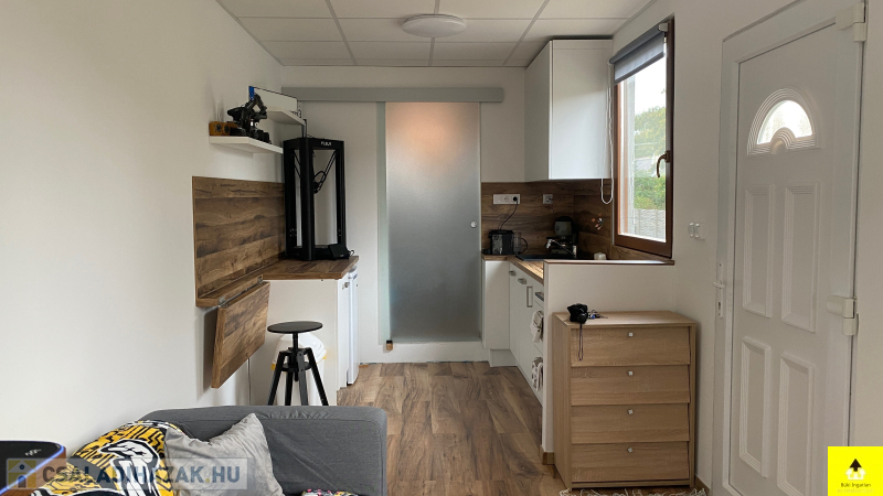 Ez az egység 12 x 2,4 méteres, kiváló állapotú, teljesen hőszigetelt lakókonténer, amely nappali-konyha, hálószoba és fürdőszoba funkciókat foglal magába. Korszerű klímával fűthető és hűthető, 3 fázisú áramellátással rendelkezik, külön betáplálás van napelemhez, így akár szigetelemű napelemrendszerről is működtethető. A napelem telepítéshez a szolgáltató által előírt 3 X 16 Amper rendelkezésre áll, amely az új kiépítés műszaki paramétereinek megfelelően 3x32 Amperig átalakítás nélkül bővíthető. Ideális akár állandó lakhatásra, akár irodának.