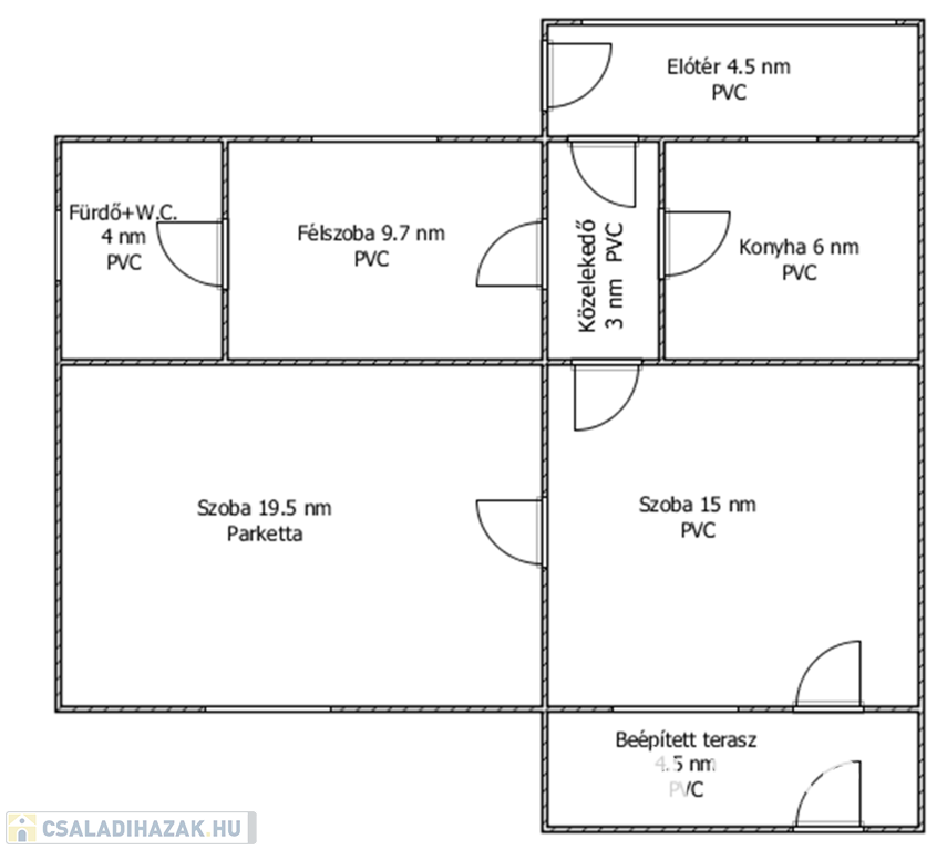 Helyiségei: 2 szoba, 1 félszoba, konyha, közlekedő, fürdőszoba, előtér, beépített terasz.