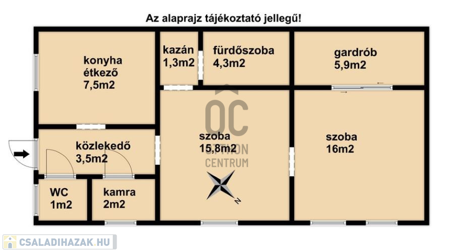 Az 57 m²-es otthon helyiségei: előszoba, kerti tároló, kamra, konyha-étkező, fürdőszoba, külön WC, gardrób és két szoba.