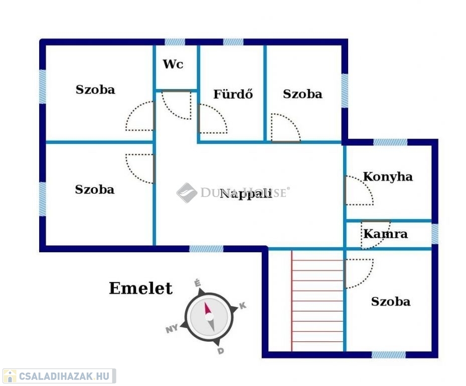 Az emeleten található napfényes és tágas nappali négy hálószobával, egy fürdőszoba tusolóval és külön wc-vel további életteret biztosítanak, míg a külön konyha és kamra lehetővé teszi a teljesen külön életvitel kialakítását. Fűtése lapradiátorokkal megoldott.
