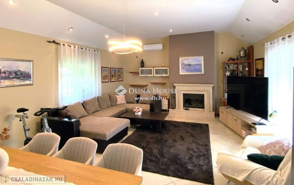A közel 20 négyzetméteres nyitott teraszról léphetünk be az ingatlanba, ahol egy 50 négyzetméteres amerikai konyhás nappali fogad minket, középpontjában egy kandallóval.