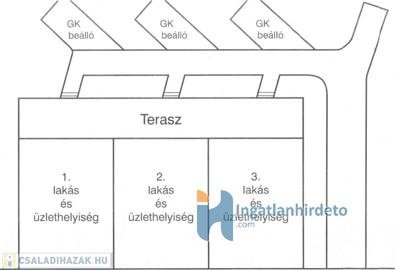 A telken kialakítható pl. 3 db sorházi-, egyenként 140 m2 emeletes ingatlan, közös udvarral, gépkocsi beállóval.