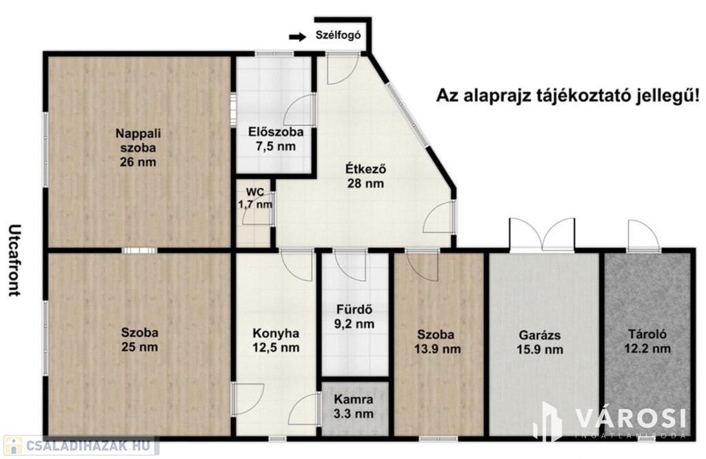 Az udvarról egy szélfogón keresztül jutunk be az étkező-nappaliba, innen nyílnak a további helyiségek: a konyha, egy szoba, a fürdő, a külön WC,. Innen juthatunk be a gardróbos előszobába, ahonnan pedig az utcafronti, egymásba nyíló szobákba.
