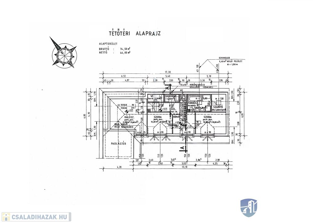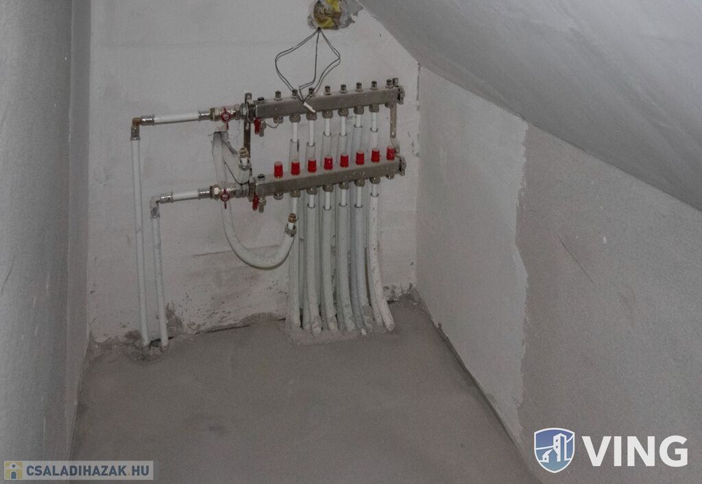 Az épület tetőtere 46 m2 hasznos területű, három hálószoba, egy fürdőszoba, szárítóhelyiség/mosókonyha került kialakításra.