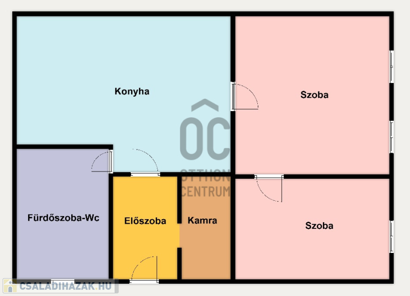 Helyiségei: 2 szoba, konyha-étkező, fürdőszoba-wc, kamra, előszoba.