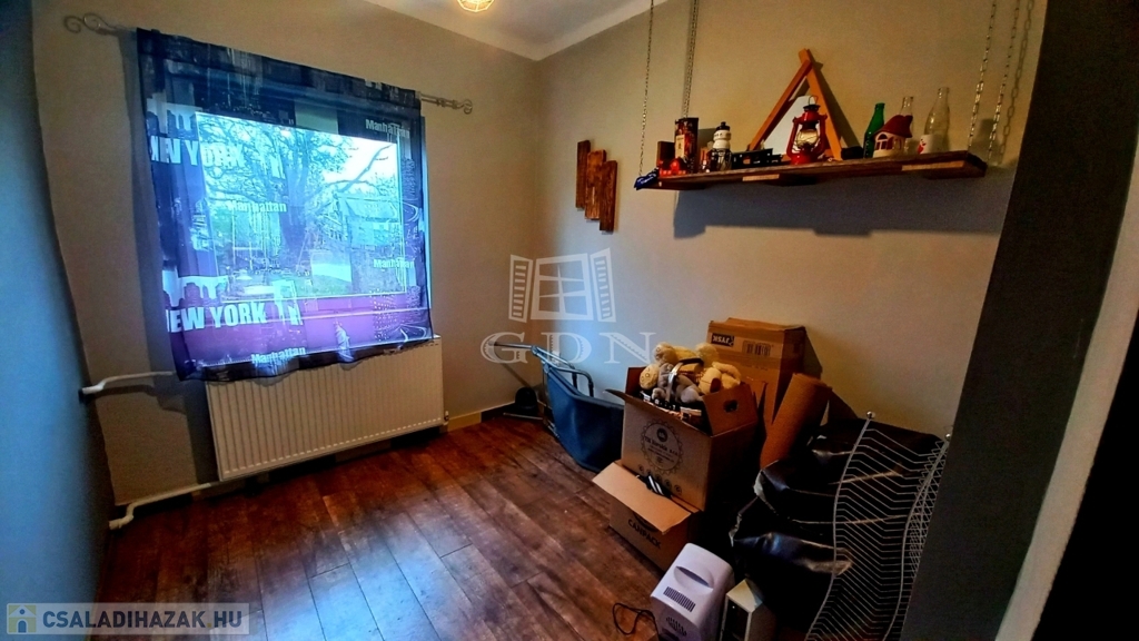 Két szoba, egy étkező és egy félszoba található az ingatlanban. A helyiségekben mindenhol radiátorok vannak. A szobák nagyméretű, korszerű nyílászárókkal felszereltek, az utcai ablakok redőnyösek. Az ingatlan fűtése vegyes tüzelésű kazánnal megoldott.