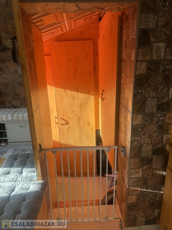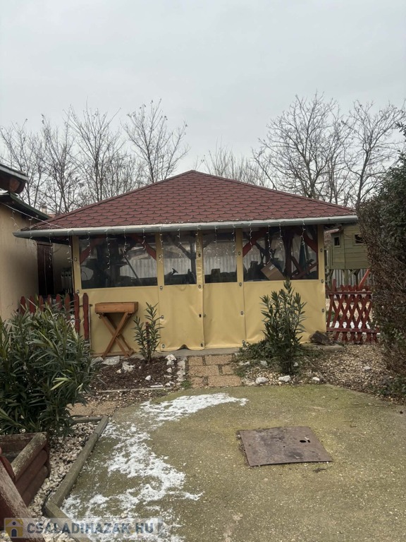 Kovácsolt vas kerítés, egy kisebb terasz, garázs, alsó épület, tároló és 4×4 méteres téliesített filagória is tartozik az ingatlanhoz, amely mögött füves terület helyezkedik el egy kis játszótérrel. A padlás szigetelt.