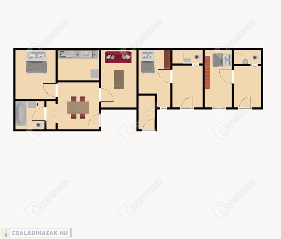 Akár több generáció részére is megfelelő lehet ez a kis családi ház. A ház 4 hálószobájához két külön bejáraton jutunk be, ezekhez külön tartozik wc és fürdő illetve van egy kis konyha sarok is mindhez.