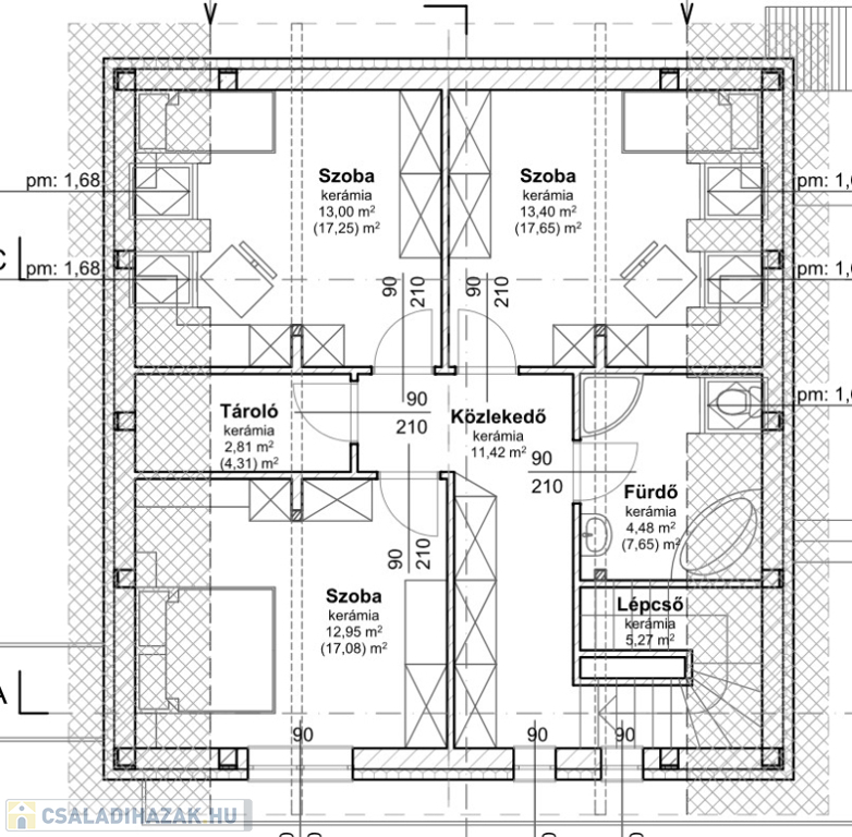 Emelet tetőtér beépítésű, 3 hálószobából kettő tetőtéri ablakkal, egy pedig rendes oldalfali ablakkal ellátott. Hasznos alapterületük 17 nm körüliek. Ezen a szinten van még egy 7 nm-es fürdő WC-vel, illetve egy tároló-gardrób helyiség (4,31 nm)