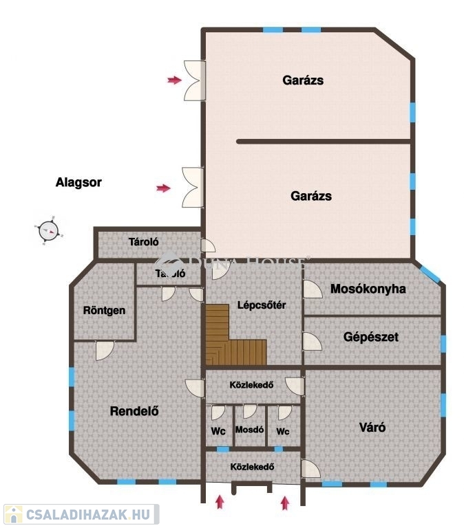 Az alagsori részen található egy fogorvosi rendelő, váró, szociális helyiségek, mosókonyha és a gépészeti helyiség. Ezen kívül két, egyenként 32 m2-es teremgarázs is helyet kapott.