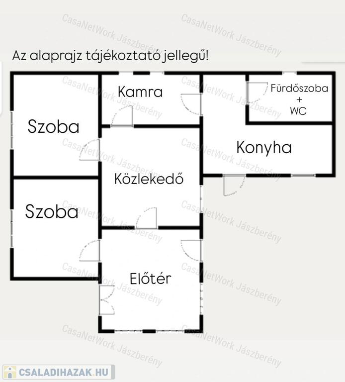 - Helyiségek: előtér, közlekedő, 2 szoba, fürdőszoba + WC, konyha, kamra