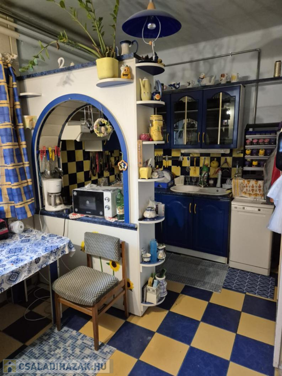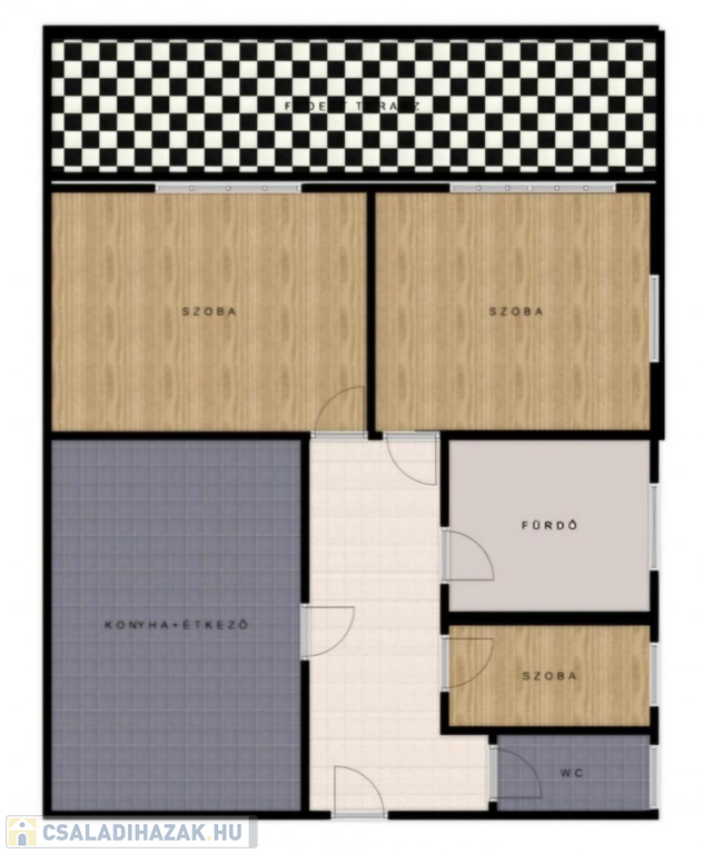 Jelenlegi elrendezése: előszoba,konyha + étkező,fürdőszoba, külön wc,2 nagy szoba,1 félszoba (gardróbszoba) valamint egy polikarbonáttal fedett terasz.