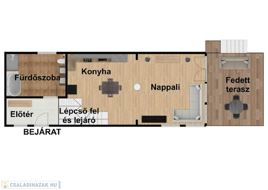 -90nm-es családi ház(amerikai konyhás nappali, 1 szoba, előszoba, fürdőszoba, háztartási helyiség) mellett 30nm-es fedett terasz