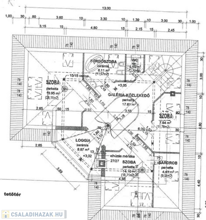 Tetőtér: két háló (br. 28 és 18 nm), egy félszoba, gardeób, fürdő, külön WC, panorámás erkély