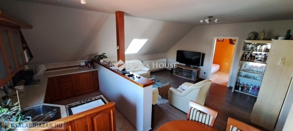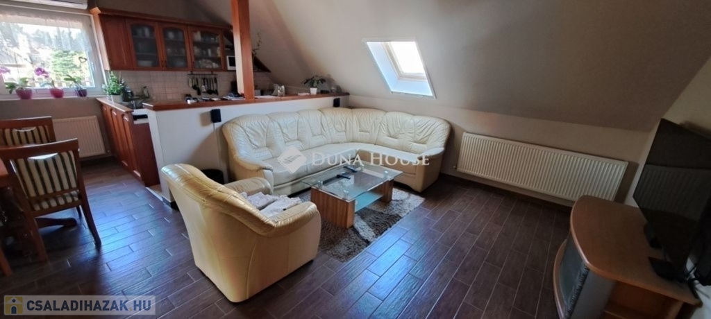 Emeleti lakás: nappali, konyha, étkező, fürdőszoba, 3 hálószoba + 26 nm-es terasz.