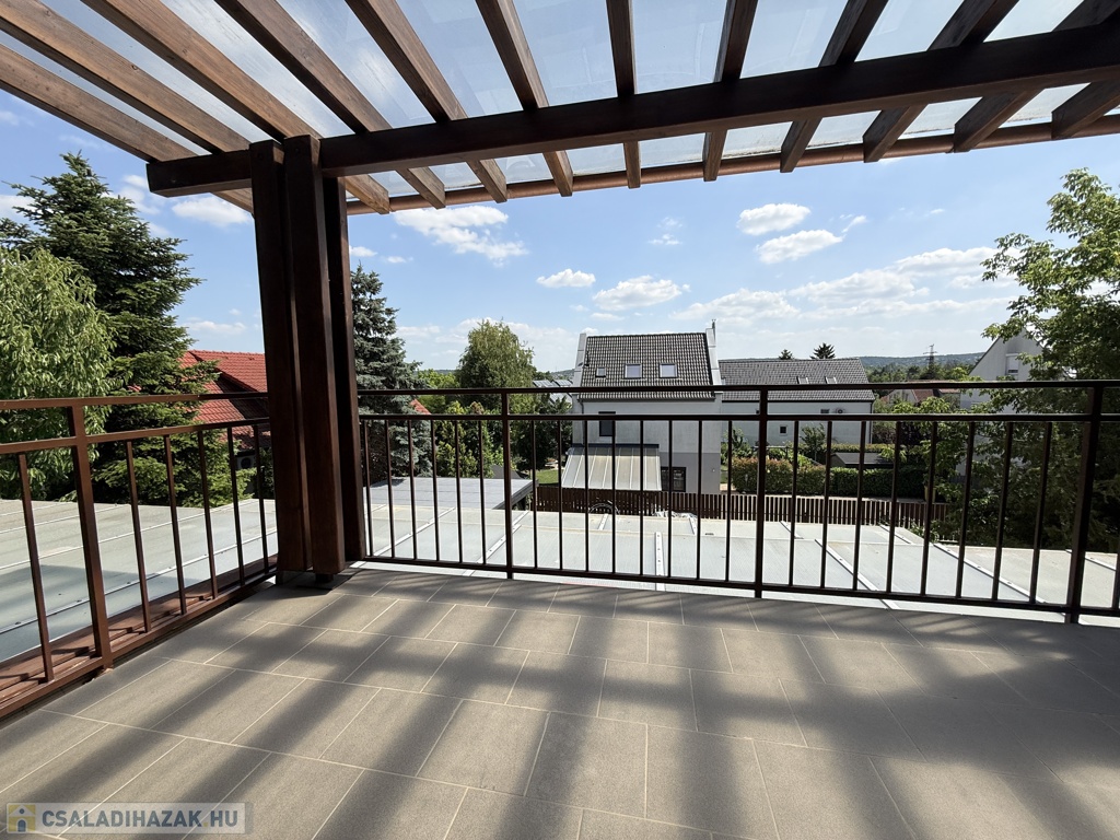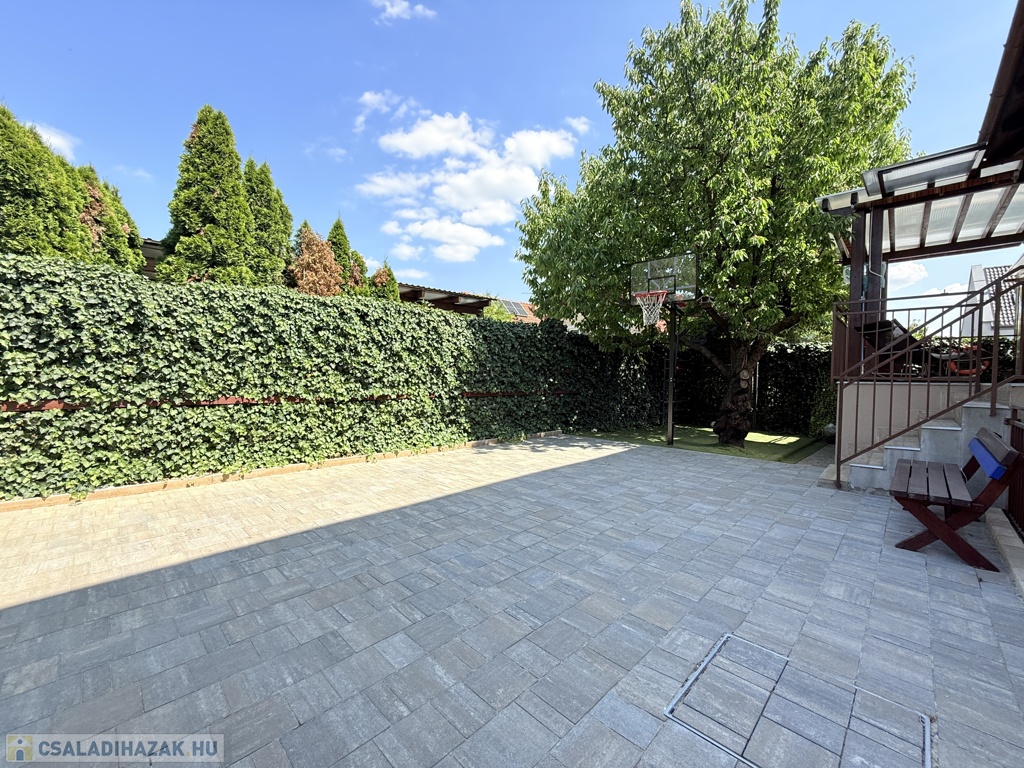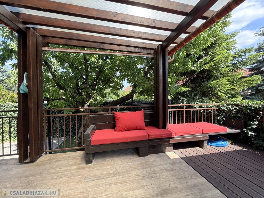Családbarát, klimatizált, fedett medencés, 4 szobás ikerházfél Budaörs zöldövezetében, a Törökugrató lábánál eladó.