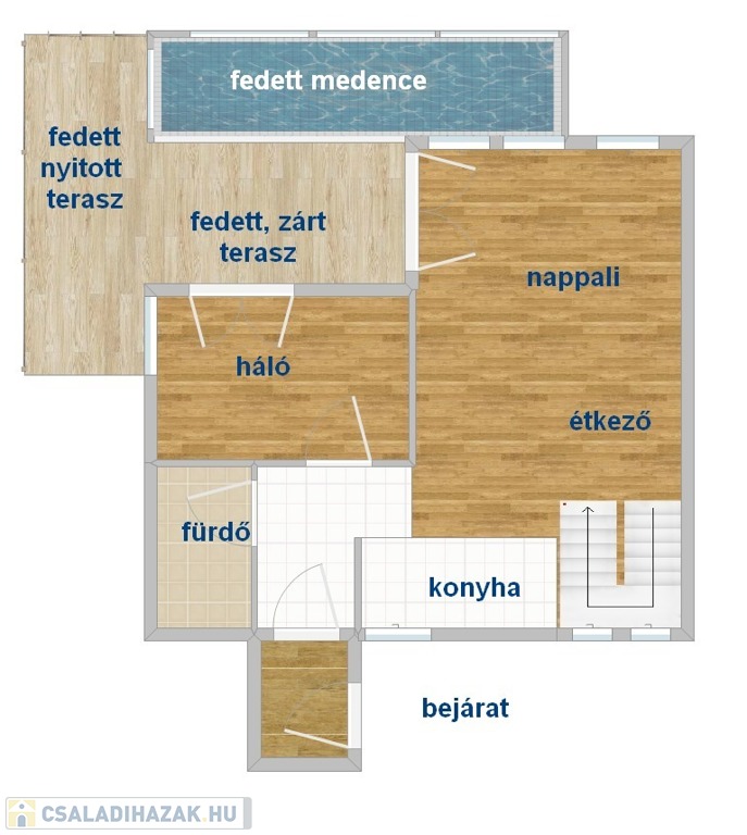 •Közvetlen kijárat a fedett, fűthető, sós vizű medencéhez (2×9 m, ellenáramoltatóval)