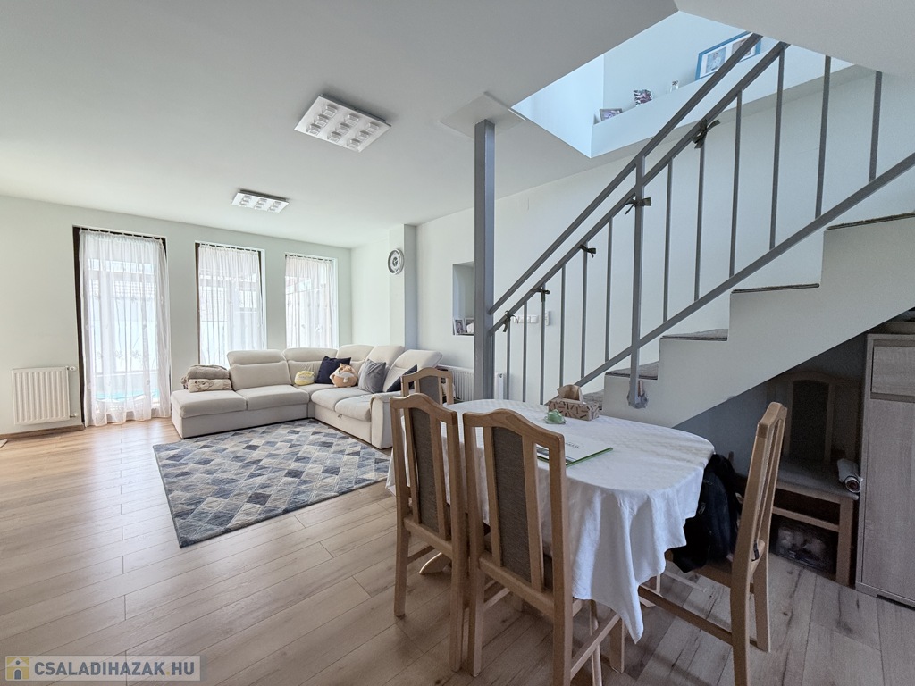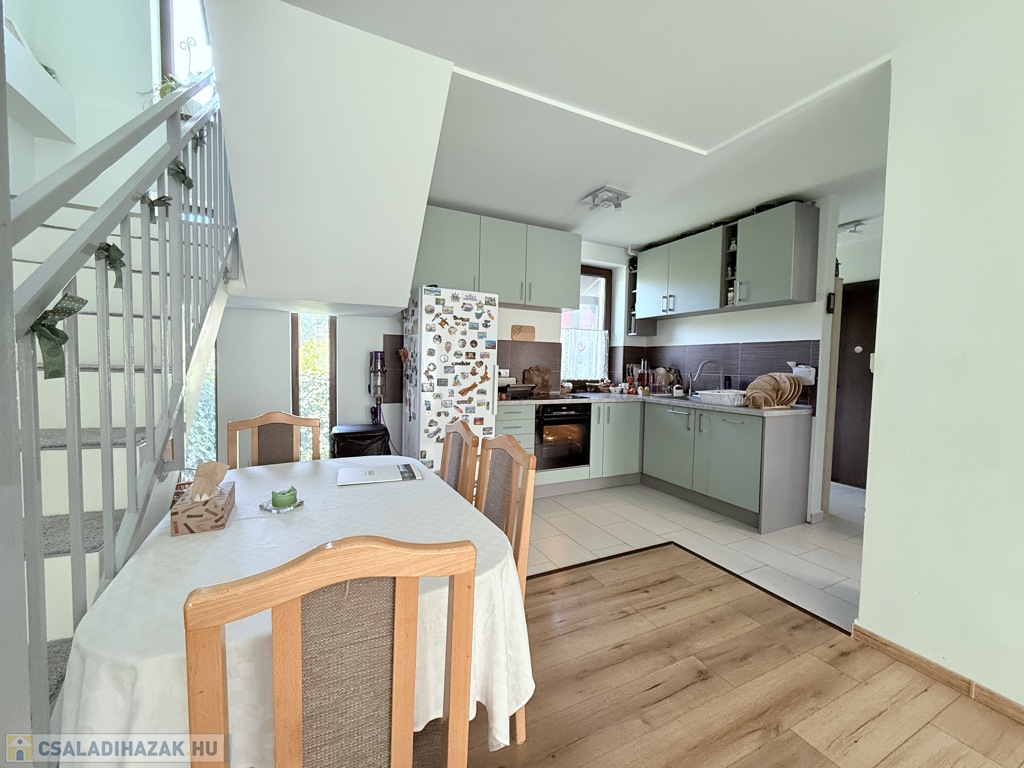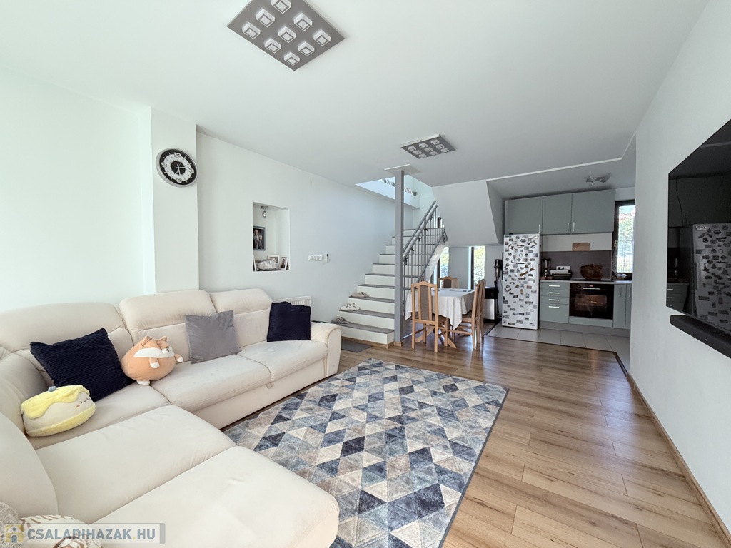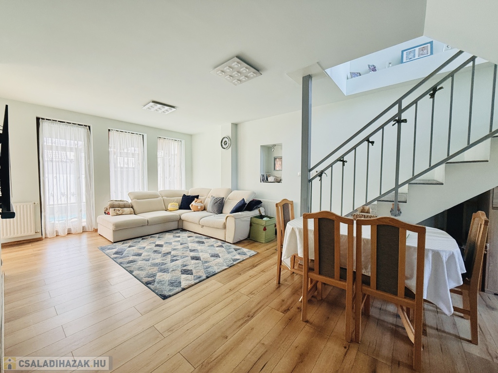 Budaörsön, csendes, zöld környezetben, 136 nm-es, nappali + 4 hálószobás ikerház-fél eladó, amely ideális választás gyermekes családoknak, otthonról dolgozóknak.