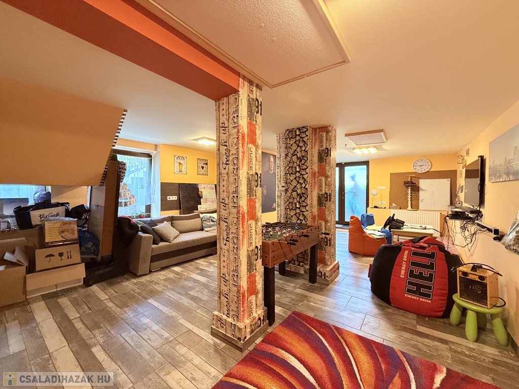 40 nm-es a nappaliból és külön bejárattal is megközelíthető, ablakos, fürdőszobával ellátott szuterén része jól használható hobbyszobának, irodának, vendégszobának.