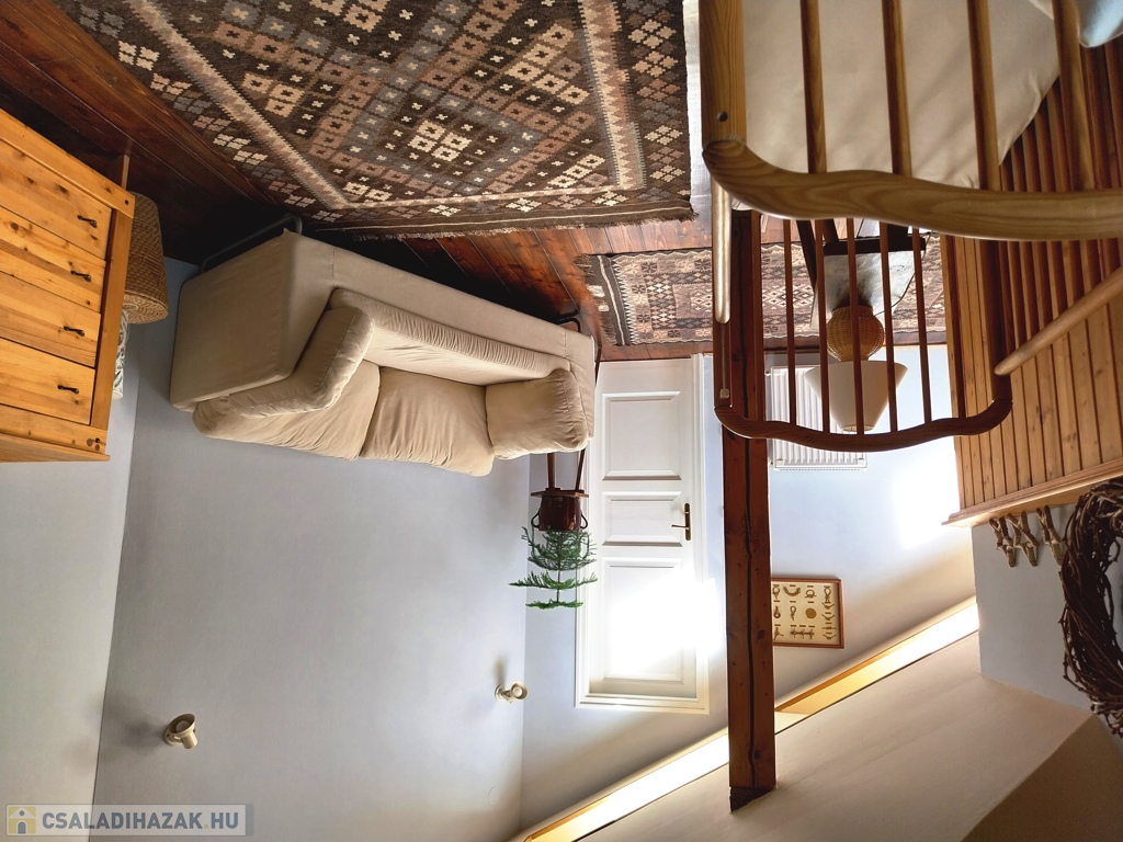 Emeleti szint: az emeletre kényelmes, elegáns, egyedi kőlépcső vezet, ahol három - tágas, jól bútorozható, külön bejáratú - hálószoba erkélykapcsolattal, ill. saját gardróbhelyiséggel és ablakos, kádas fürdőszoba található.