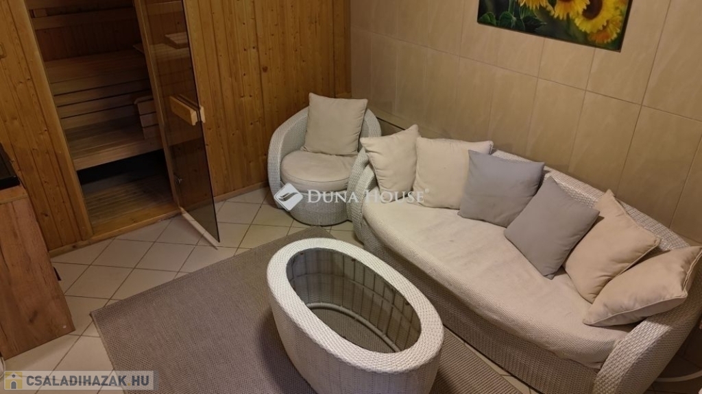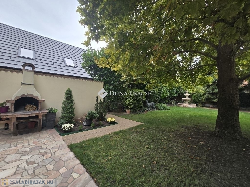 Parkolni a tágas duplagarázsban lehet, ill. egy fedett autóbeállón és a ház előtt is kényelmesen elfér több autó.