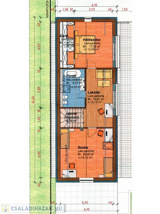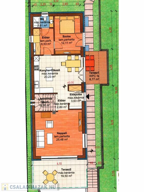 A földszinten nappali, nagy étkező-konyha, hálószoba, zuhanyzós fürdőszoba, gardrób, előszoba, 2 terasz került kialakításra.