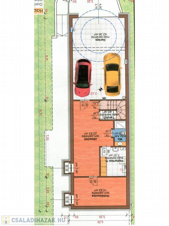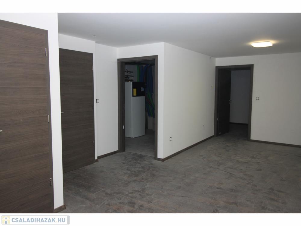 Az alagsorban 2 gépkocsi parkolására alkalmas garázs, nagy ,tágas ,több célra használható előtér, hobbiszoba, zuhanyzó WC-vel és háztartási helyiség található.