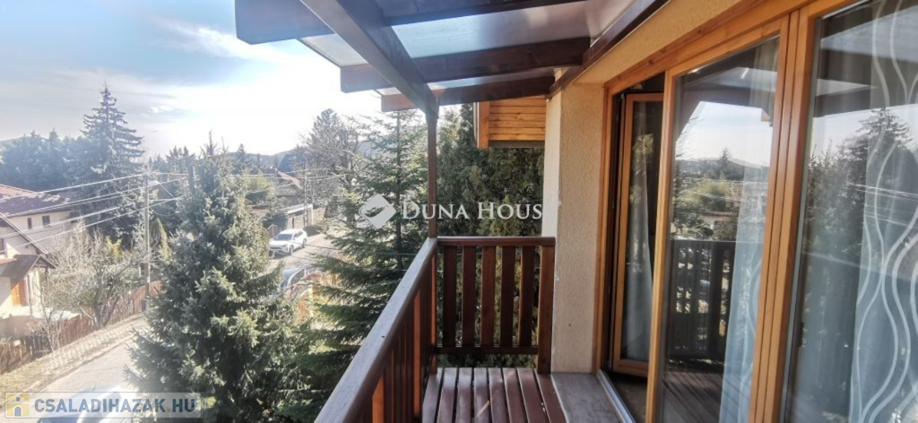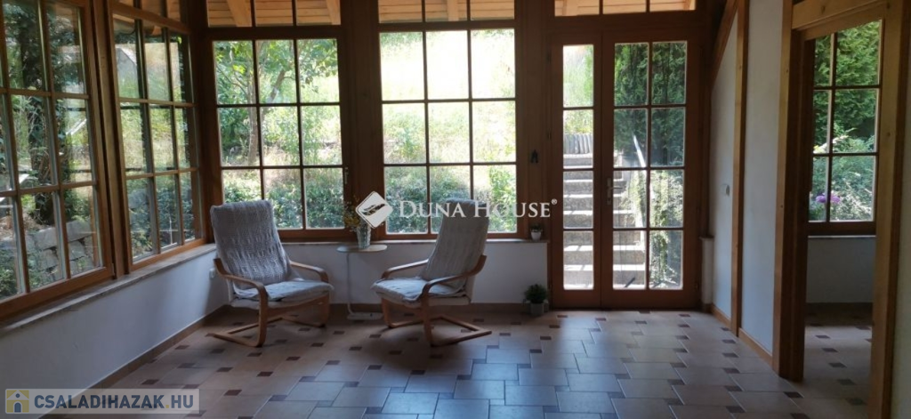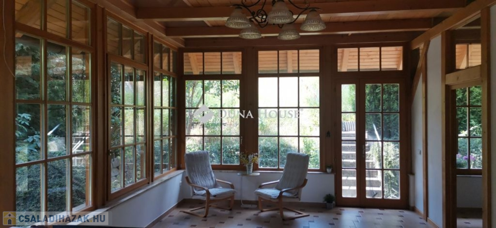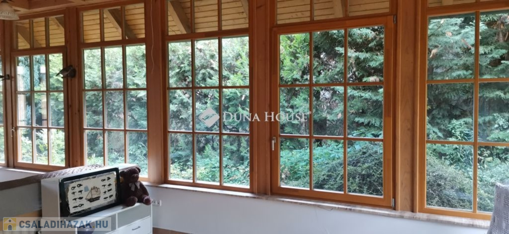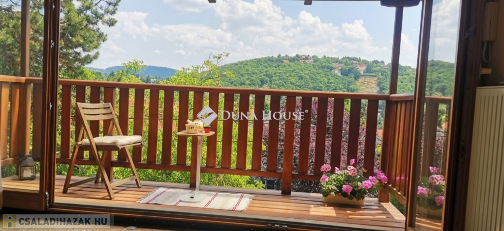 A felső szinten ezen kívül egy kisebb szoba, gyerekszoba található, melllette zuhanyzós fürdőszoba wc-vel és a hálószoba a teljes faltól-falig tartó diófa terasszal! Erről a fedett teraszról is lenyűgöző, örökpanorámás kilátás nyílik a budai hegyekre, amelyet a teljes szélességében eltolható nyílászárókkal élvezhetünk maximálisan.