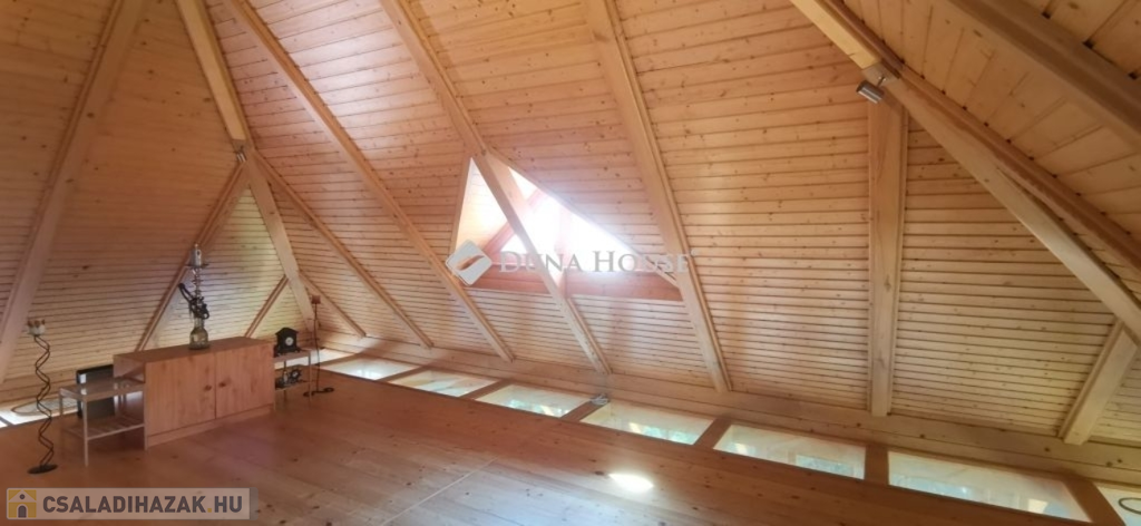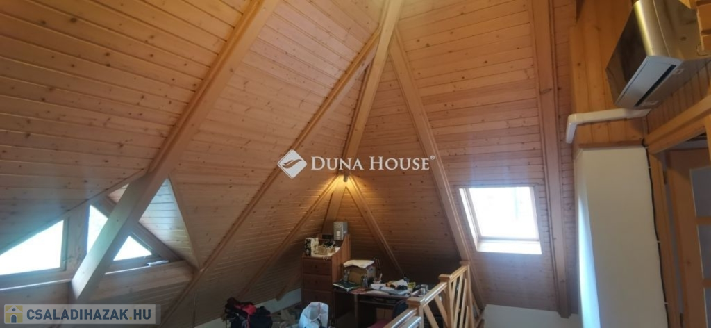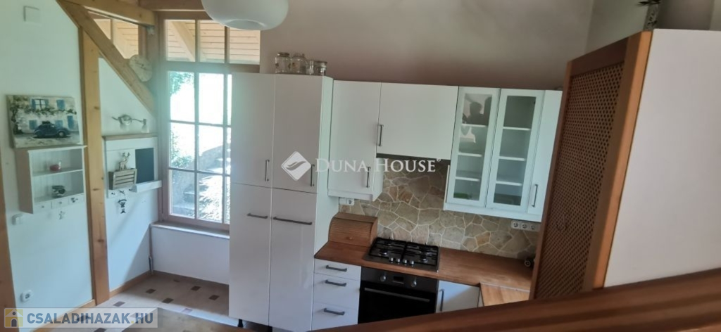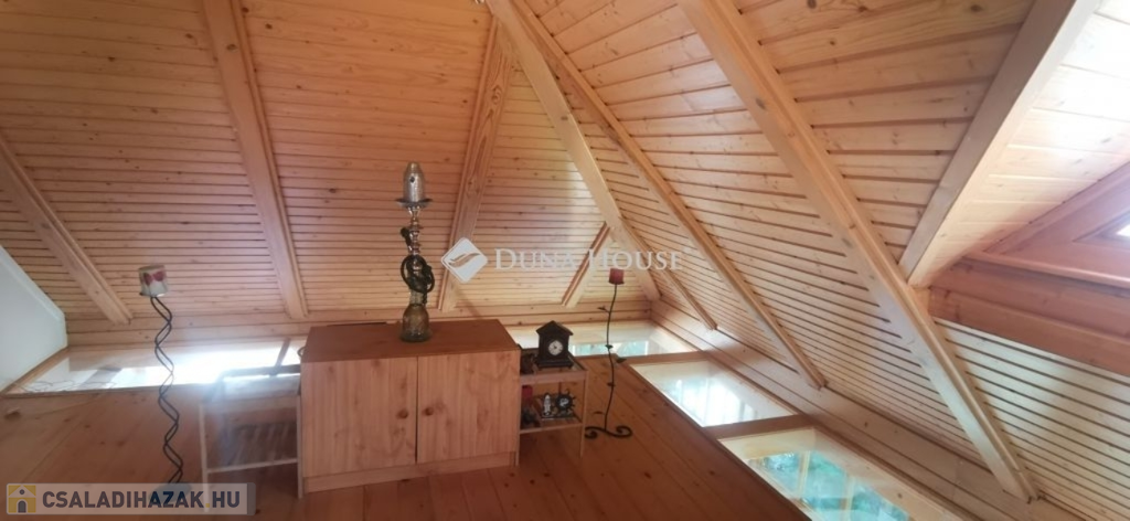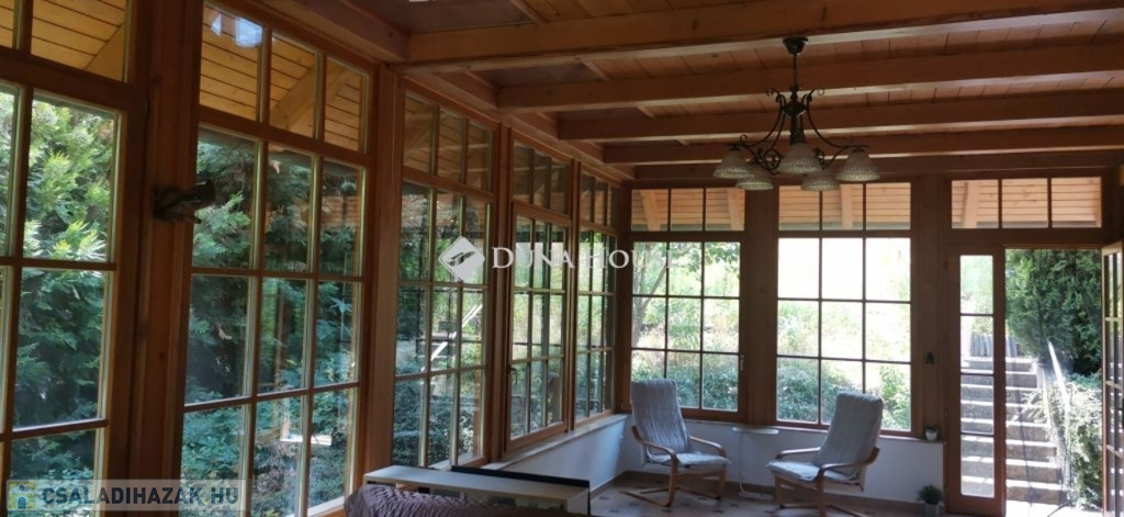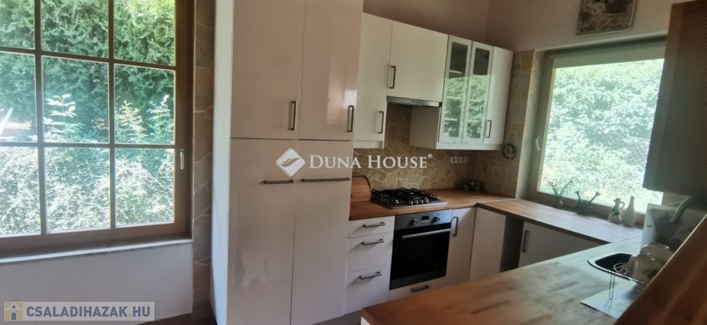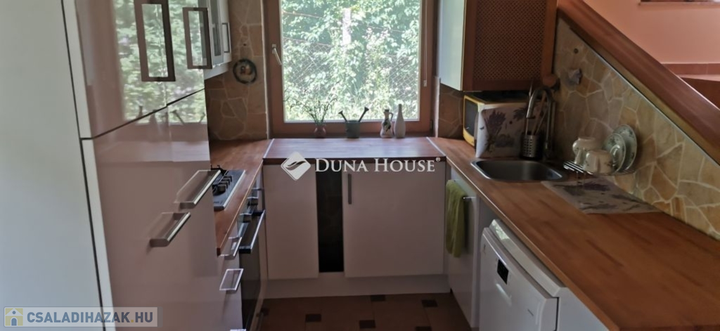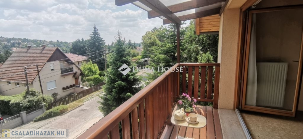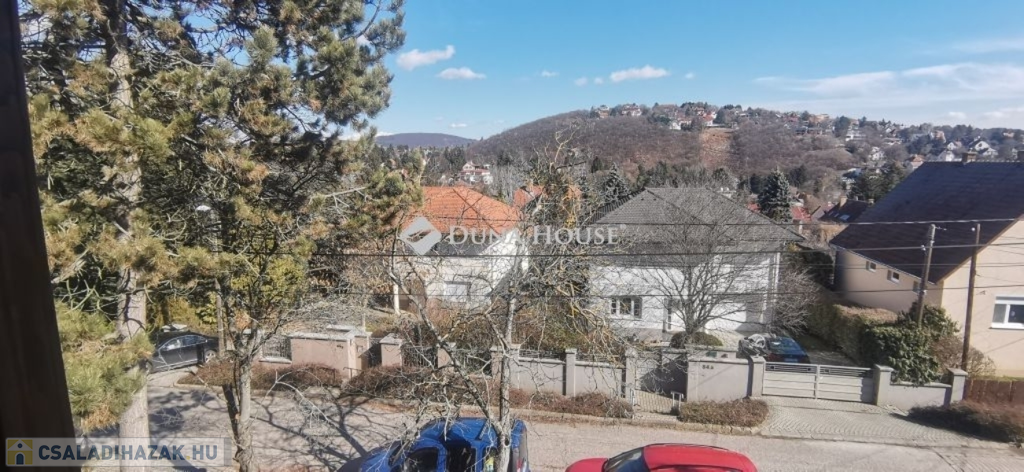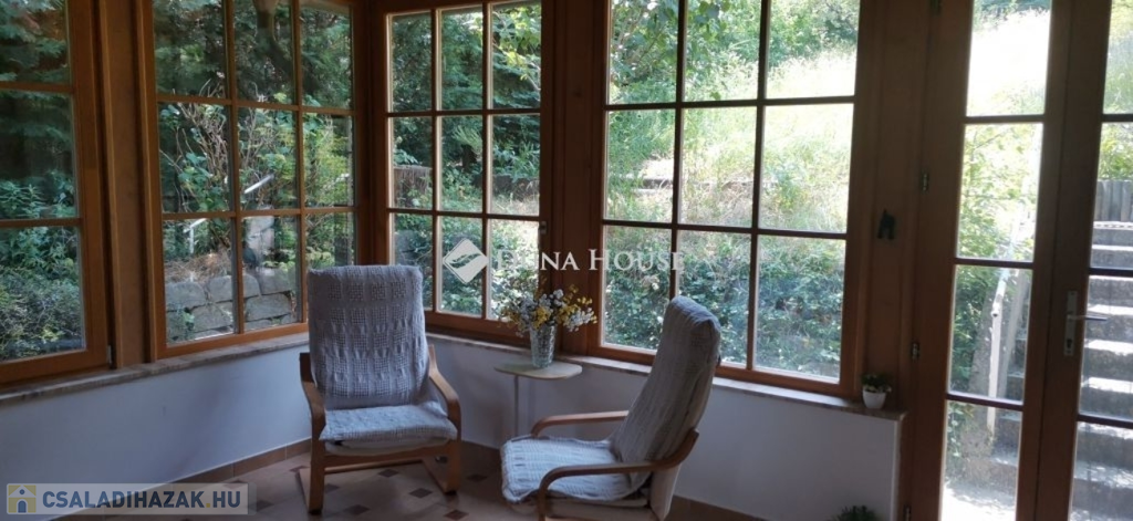 A ház 2005-ben épült, egyedi kialakítású, tetőtér beépítéses, kétszintes tégla családi ház. Az ingatlan egyik nagy előnye, hogy akár két generáció együttélésére is alkalmas. Együtt de mégis külön! A házat egy hatalmas kert, borospince, nagyméretű garázs, valamint további autóbeállási lehetőség teszi még kényelmesebbé a nagycsaládosok számára.Fűtése, meleg víz ellátása gáz cirkóval megoldott, a földszinten padlófűtéssel kiegészítve.A két generációs házban az egyik lakrész 35 m2 nagyságú, a földszinten a bejárattól jobbra található, amely áll egy előtérből nyiló szobából, konyhából és fürdőszobából, wc-vel. A konyhából egy átadó ablak nyílik a nappaliban lévő étkezőasztal felé, amely a családi összejöveteken praktikus megoldás a vendégek kiszolgálására. A nappali különös hangulatát a három oldalán elhelyezkedő kazettás fa ablakok adják, melyek révén mintha közvetlenül a fák tövében ülnénk, miközben szemlélhetjük a természet zöldjét az énekesmadarak, a mókusok játékát. Igazán különleges érzés, bent vagyunk, de mégis kint érezzük magunkat!A másik lakrészhez tartozó konyha a tágas nappali túloldaláról nyílik, amely a hátsó kertre nyílik és az oldalkertre néz, modern és kényelmes U-alakú elrendezésével. Itt található még egy háztartási helység és egy wc mosdóval. Innen jutunk fel a kétkarú lépcsőn az emeletre, amely egy egy légterű, fenyőfával burkolt tetőtéri nappali dolgozósarokkal. Ez egy légkondcionálóval ellátott, napfényes, hatalmas belső tér, amely sok lehetőséget rejt magában, plusz érdekes megoldás, hogy körben üvegpadló van, amely a fölszinti nappalit is plusz természetes fénnyel látja el. Nagyon hangulatos, a fényképek nem adják vissza, hogy mennyivel növeli a térérzetet ez a különleges padló kialakítás.A felső szinten ezen kívül egy kisebb szoba, gyerekszoba található, melllette zuhanyzós fürdőszoba wc-vel és a hálószoba a teljes faltól-falig tartó diófa terasszal! Erről a fedett teraszról is lenyűgöző, örökpanorámás kilátás nyílik a budai hegyekre, amelyet a teljes szélességében eltolható nyílászárókkal élvezhetünk maximálisan. A kert hatalmas, kissé emelkedik felfelé a kert vége felé, felúton a domboldali borospince, amely egy földdel borított boltíves hobbit pince.A ház szigetelt, szépen bevakolt, nagyon jó állapotban van, a tulajdonosok építették a család részére, kezdetnek nyaralóként, aztán állandó lakhelyként szolgált. Jelenleg nem lakják az ingatlant, gyorsan birtokba vehető. A környék csendes, pár utcával odébb található buszjárat 10 perc alatt Hűvösvölgyben van, onnan a város fél óra alatt elérhető. A közelben óvoda, iskolák, kisebb boltok, éttermek, szolgáltatók megtalálhatóak és persze rengeteg kirándulási lehetőség.Nézzük meg együtt, ne maradjon le erről a hangulatos, egyedülálló ingatlanról! Töltse már itt a nyarat!