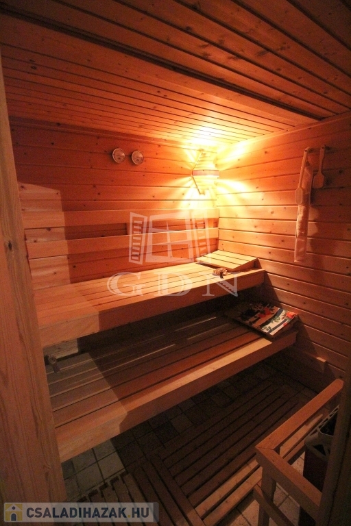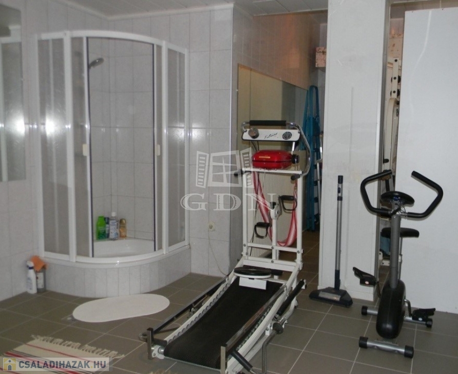 ALAGSOR: 2 állásos garázs mellett, fitness terem, 4 fős szauna, zuhanyzó, külön helyiségben a mosókonyha, gépészeti helység.