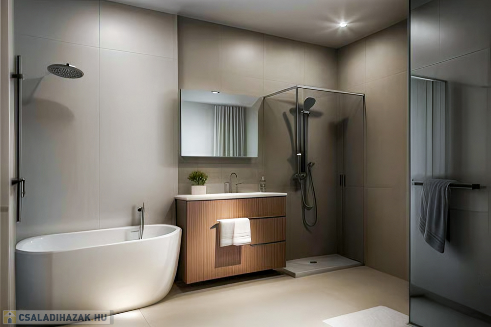 Szaniterek: Kád: H2O Mona, Zuhany tálca: H2O Nero, Mosdó kézmosó, w.c., bidé: Roca Debba. Csaptelepek: Hansgrohe