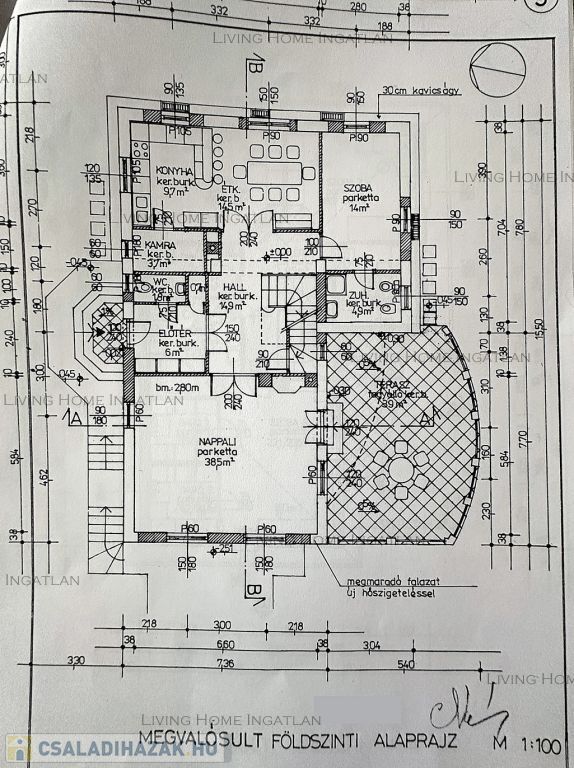 A detached house of 270 sqm for sale in a quiet, family house environment, close to nature. The entire lower floor is not included in this square meter. The property is also suitable as a business premises, as the yard can comfortably park several cars. A yoga studio used to operate in the house, taking advantage of the lower floor. The 716 sqm landscaped garden surrounded by large trees and the terrace on the higher level provide a pleasant, peaceful place for relaxation and gatherings of friends.