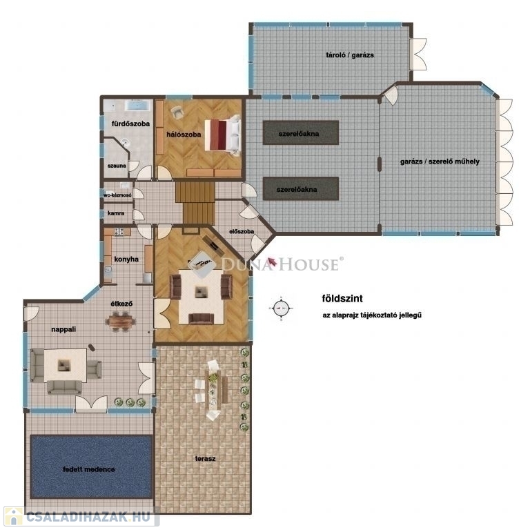 - 30 m2 beépített terasz közvetlen átjárással a nappaliba, a teraszon fedett 6 x 3 x 1,5 m mély medence