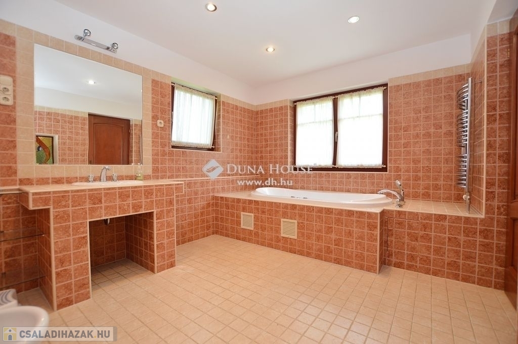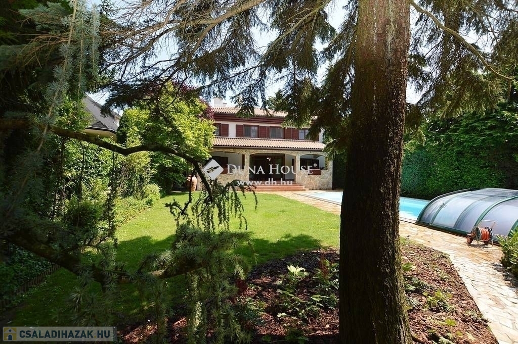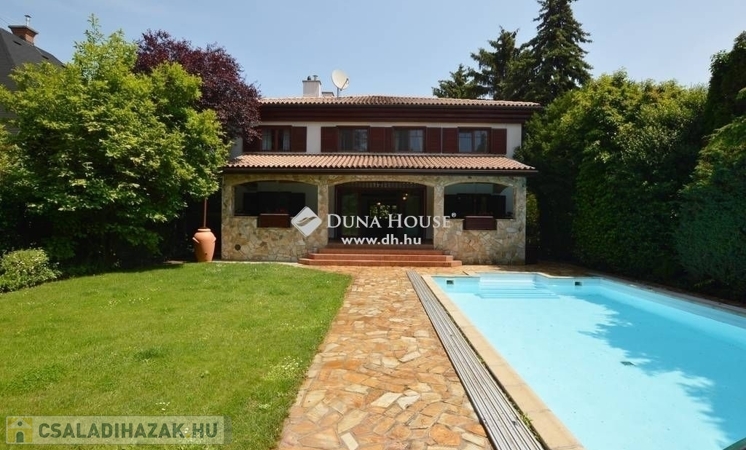 Budaligeten eladó egy nappali + 5 szobás, mediterrán stílusú, medencés családi ház.