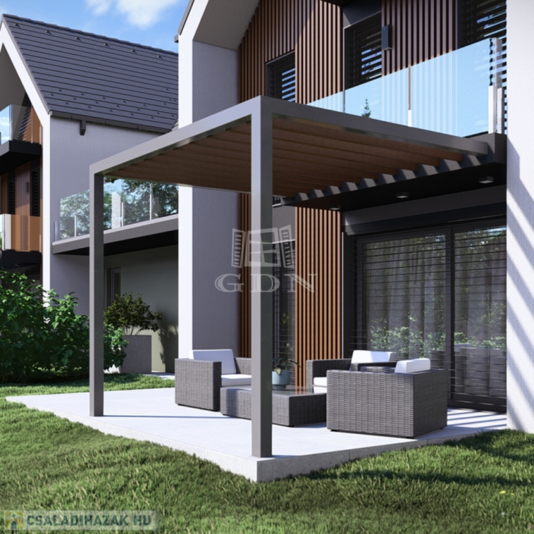 - Olasz bioklimatikus pergóla forgatható lamellákkal és LED szalaggal,