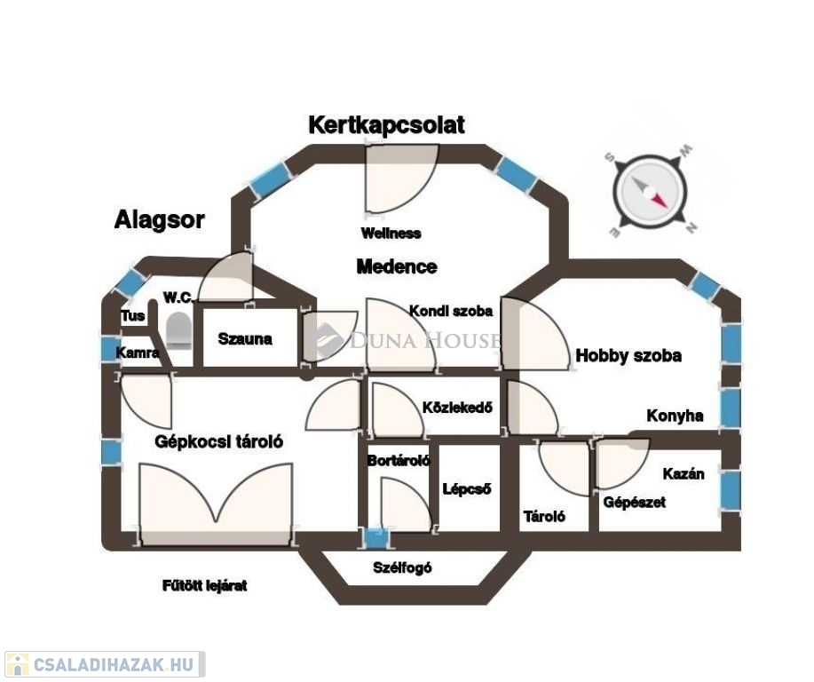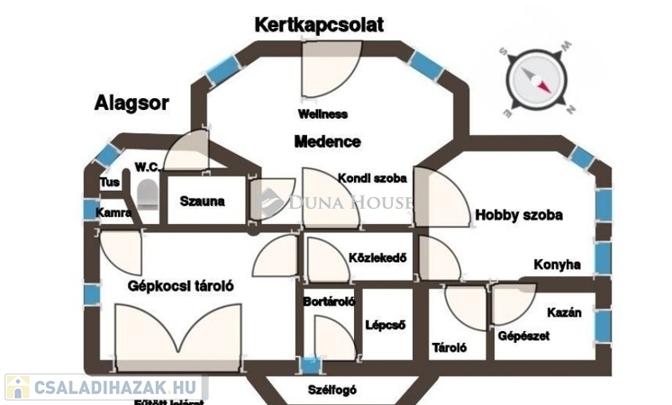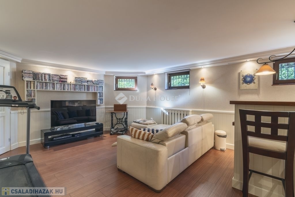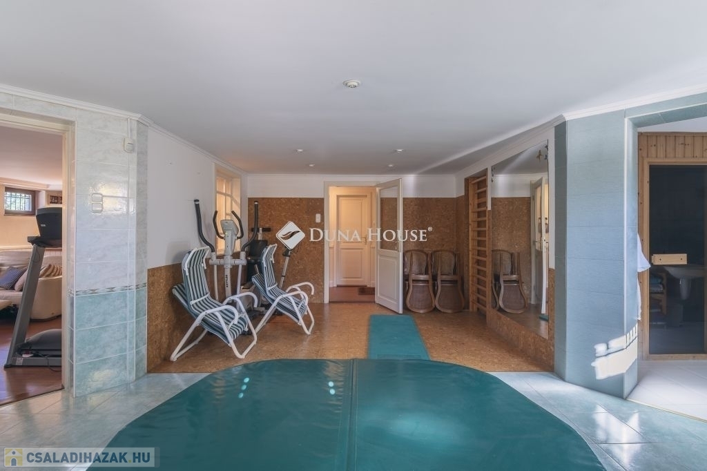 A családi ház átgondolt tervezés eredményeként az alsó szinten található 2 állásos gépkocsi tárolóval, jacuzzi, szauna, kondi- és hobby szoba, bortároló, kamra, tároló, mosó- és szárító helyiség, további tárolóval. Kertkapcsolatos ez a szint, így a privát napozó teraszra léphetünk ki innen.