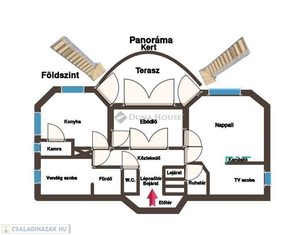A földszinten az előszobából, külön is nyílik minden helyiség, a bal és a jobb oldali helyiségek és a külső formák tükörképei egymásnak. A ház központi részén a családi ebédlő, amelyből egyik irányba a konyha-kamra, a másik oldalon a családi nappali és TV szoba, amelyet hangulatos kandalló választ el egymástól. Mindhárom térből kiléphetünk a napos és panorámás teraszra, ahonnan csodálhatjuk az elénk táruló természetvédelmi területet, a kilátókat és akár a naplementét. Ezen a szinten található még egy dolgozó/vendégszoba és ehhez közvetlenül kapcsolódóan egy fürdőszoba W.C.-vel.