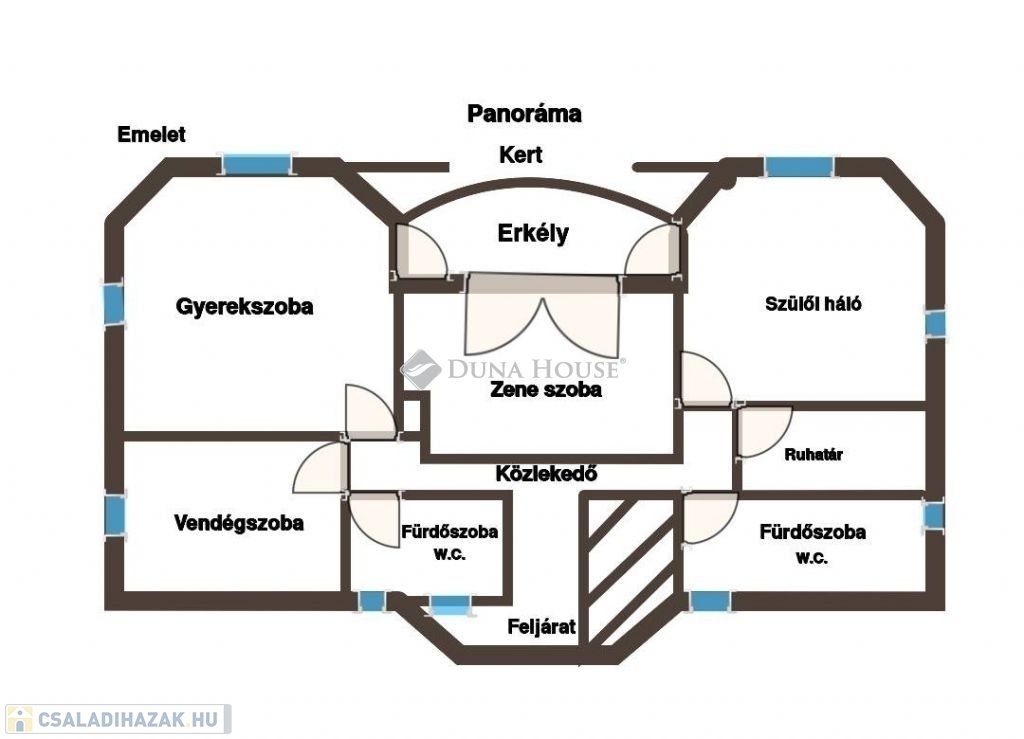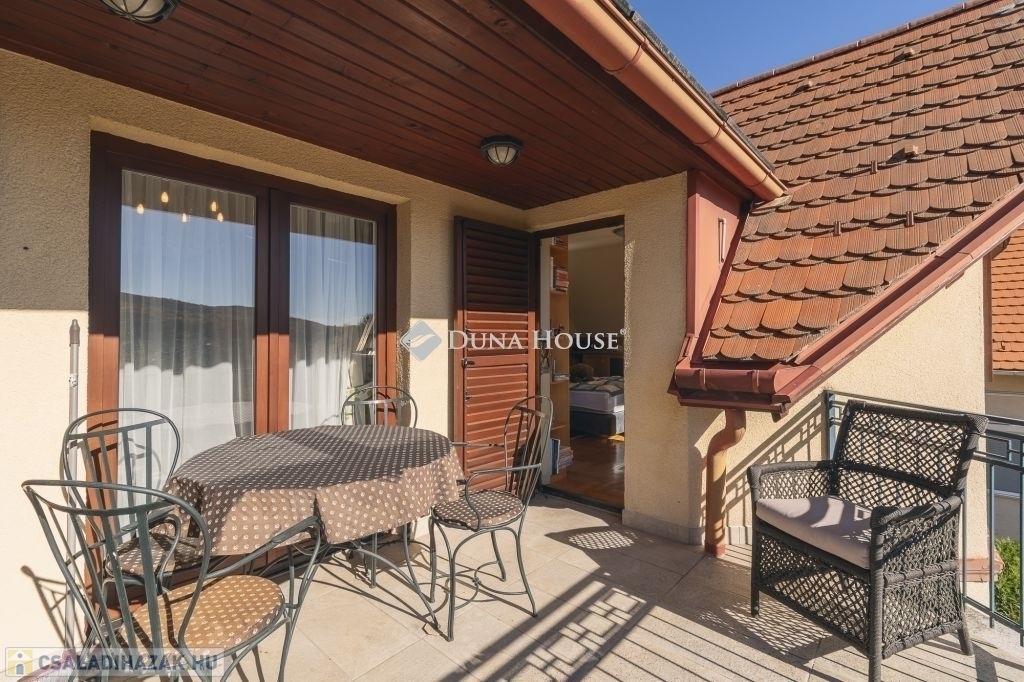 A felső szinten, a földszinti kialakításhoz hasonlóan a központi térben egy közösségi tér, zeneszoba, tőle balra a gyerekszoba és jobbra a szülői hálószoba. Mindhárom szobából kijárat a kb. 12 nm-es DNY-i tájolású, 180 fokos panorámával rendelkező erkélyre. A szülői hálóhoz kapcsolódik egy gardróbszoba és egy kádas fürdőszoba. A szinten található még egy további vendégszoba, saját tusolós fürdőszoba W.C.-vel.